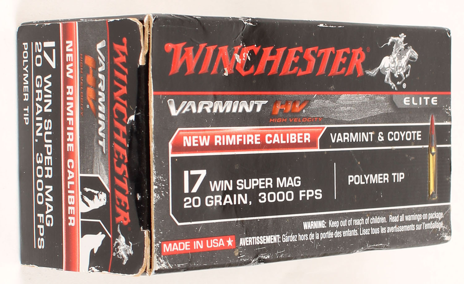 Winchester, Varmint GV, .17 Winchester Super Mag, Grain Polymer Tip, 3,000 FPS, Full, 1pc. Black & Red box, box is solid with excellent to minty color, very minor edge & corner wear, end flaps are solid, ammo is minty. Grade: Excellent - Value: 20 to 30