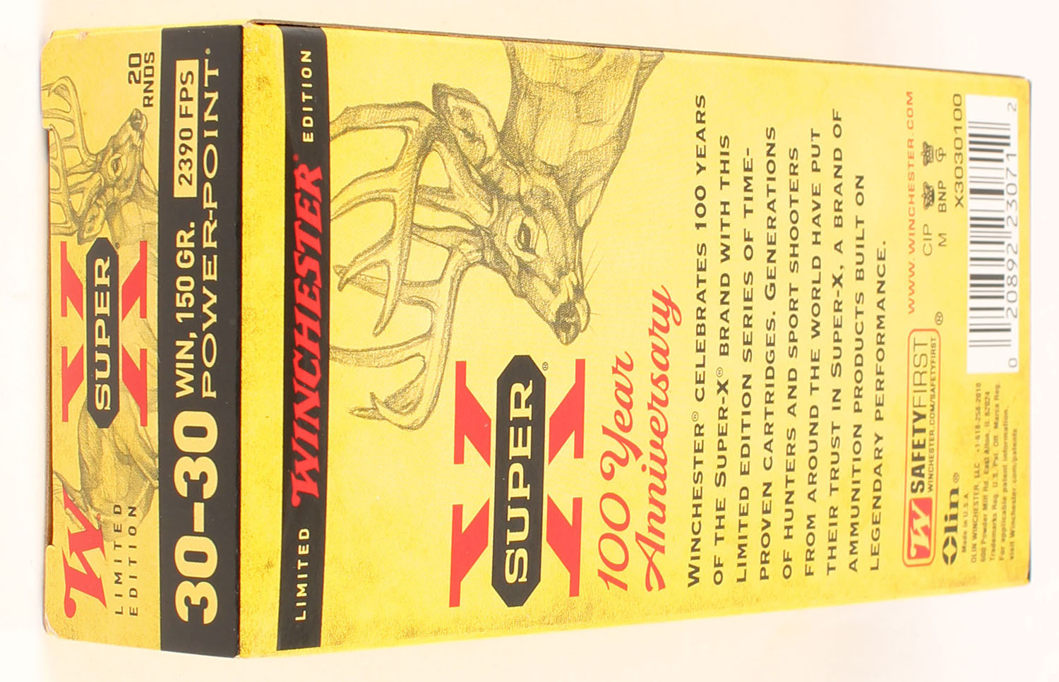 Winchester, 100 Year Anniversary Super X, .30-30 Winchester, 150 Grain Power-Point, Full, 1pc. Yellow red & black box, box is MINT with minty color, corners are sharp, edges are crisp, end flaps are solid, ammo is minty. Grade: MINT - Value: 40 to 60