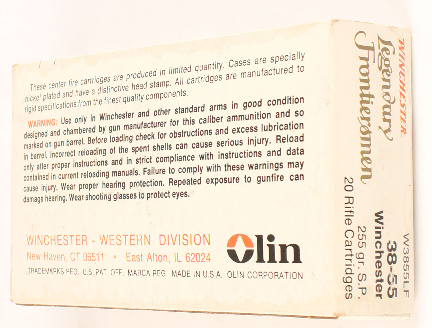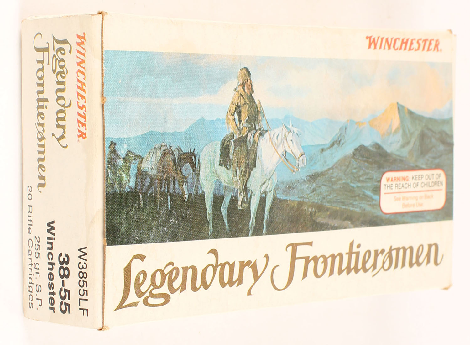 Winchester, Legendary Frontiersmen, .38-55 Winchester, 255 Grain Soft Point, Full, 1pc. Multi-colored box, box is solid with very good to excellent color, some staining, minor corner wear, edges are mostly crisp, end flaps are solid, ammo is minty. Grade: Very Good ++ - Value: 80 to 120