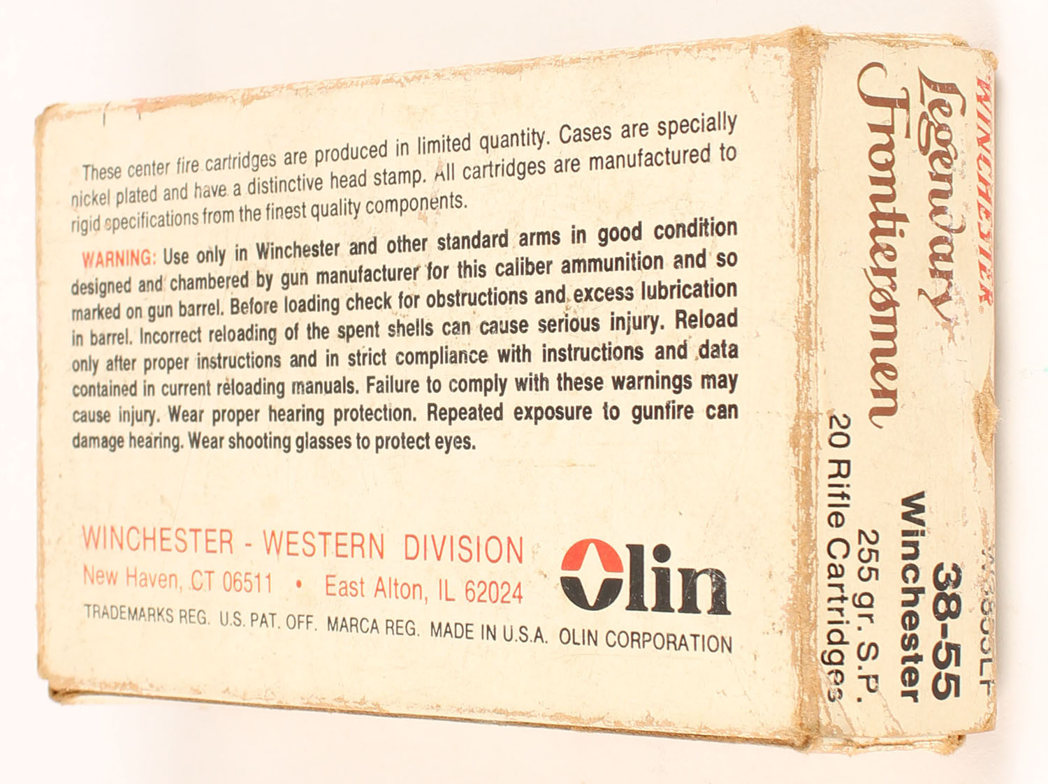 Winchester, Legendary Frontiersmen, .38-55 Winchester, 255 Grain Soft Point, Partial 11rds. correct, 1pc. Multi-colored box, box is solid with very good color, some age soiling, edge & corner wear, end flaps are solid, ammo is excellent. Grade: Very Good - Value: 30 to 45