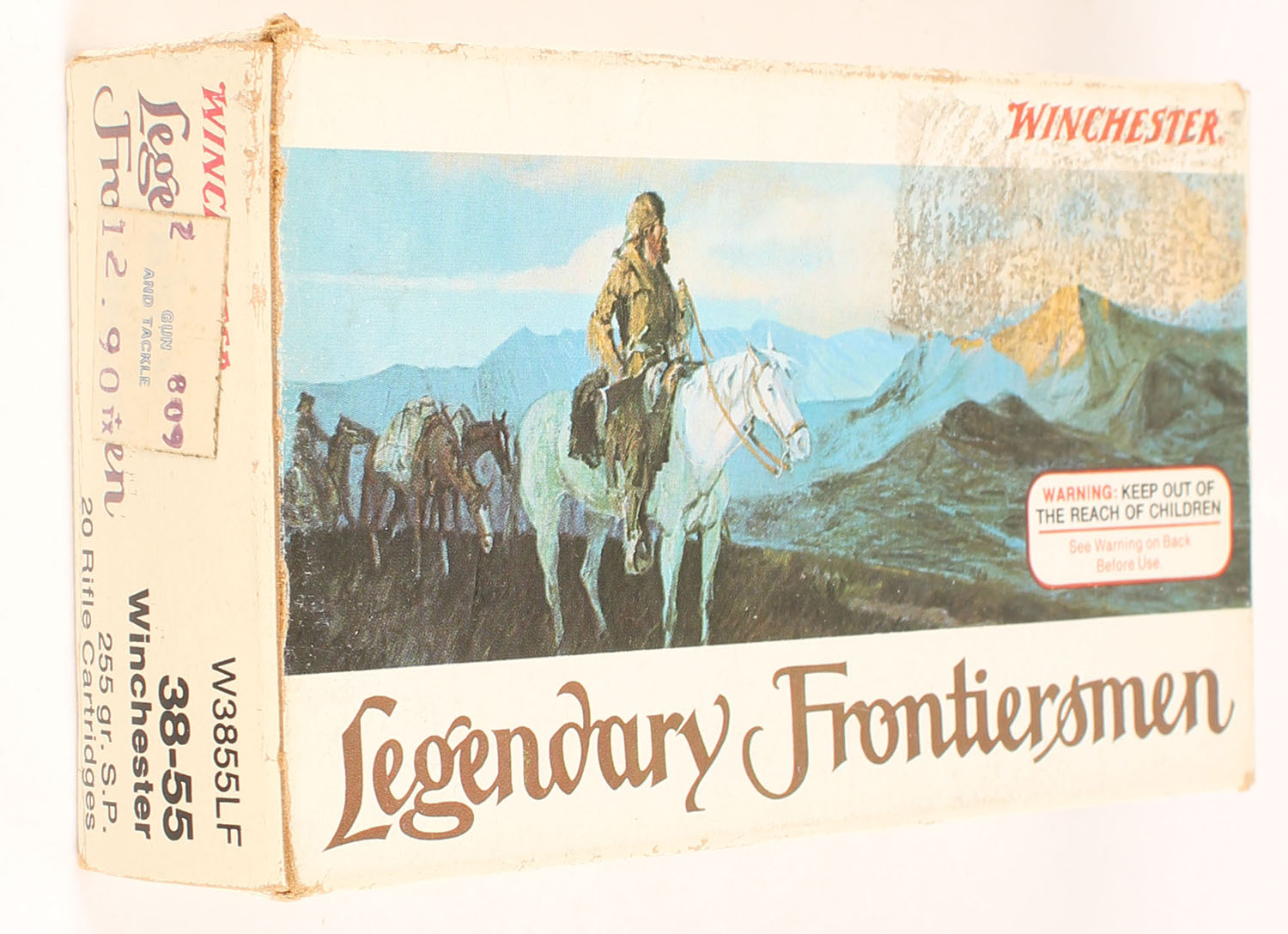 Winchester, Legendary Frontiersmen, .38-55 Winchester, 255 Grain Soft Point, Full, 1pc. Multi-colored box, box is solid with very good to excellent color, some edge & corner wear, end flaps are solid, ammo is excellent. Grade: Very Good + - Value: 50 to 75