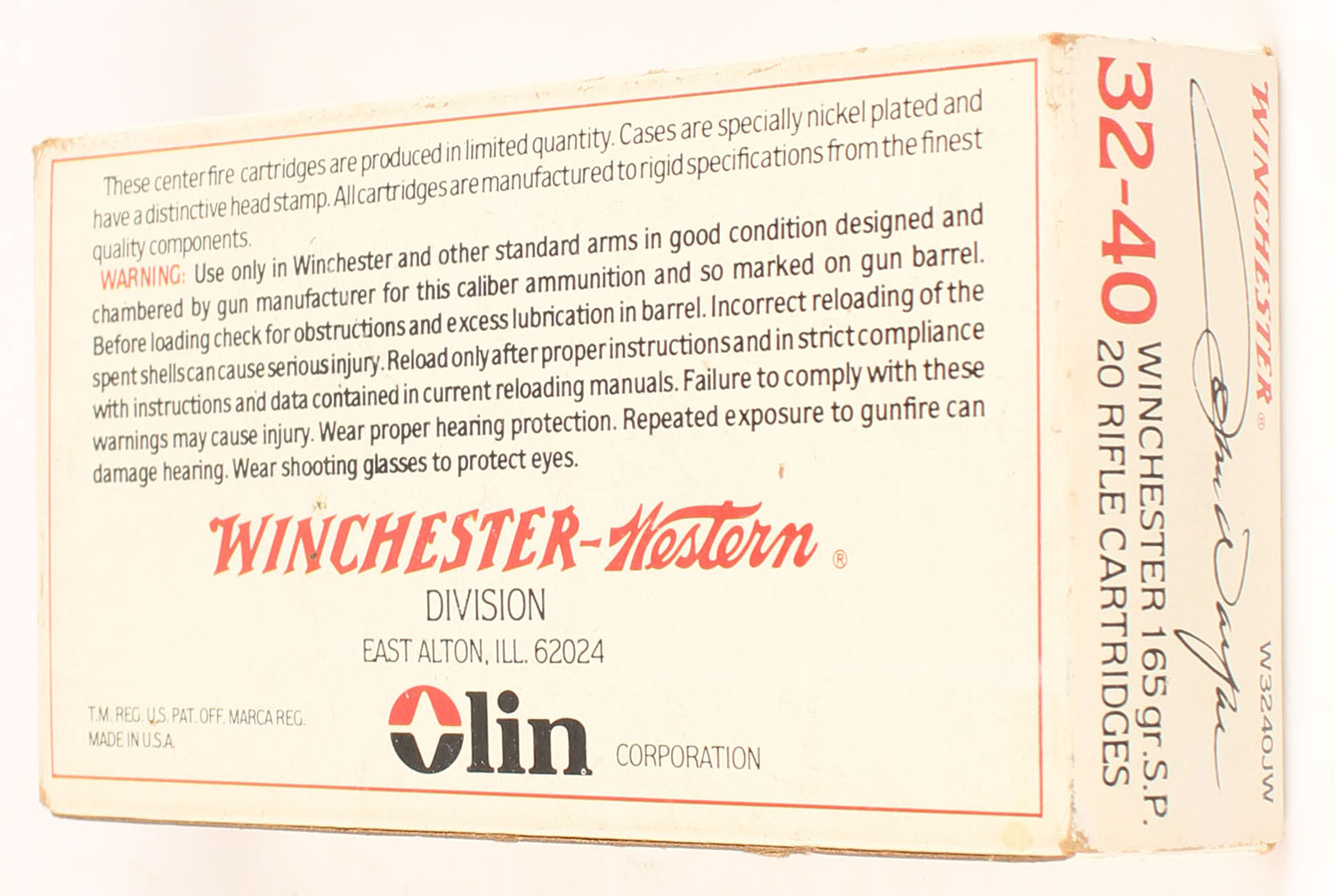 Winchester, John Wayne, .32-40 Winchester, 165 Grain Soft Point, Full, 1pc. White box featuring John Wayne, box is solid with excellent color, very minor edge & corner wear, crease on front side, end flaps are solid, ammo is minty. Grade: Excellent - Value: 80 to 120
