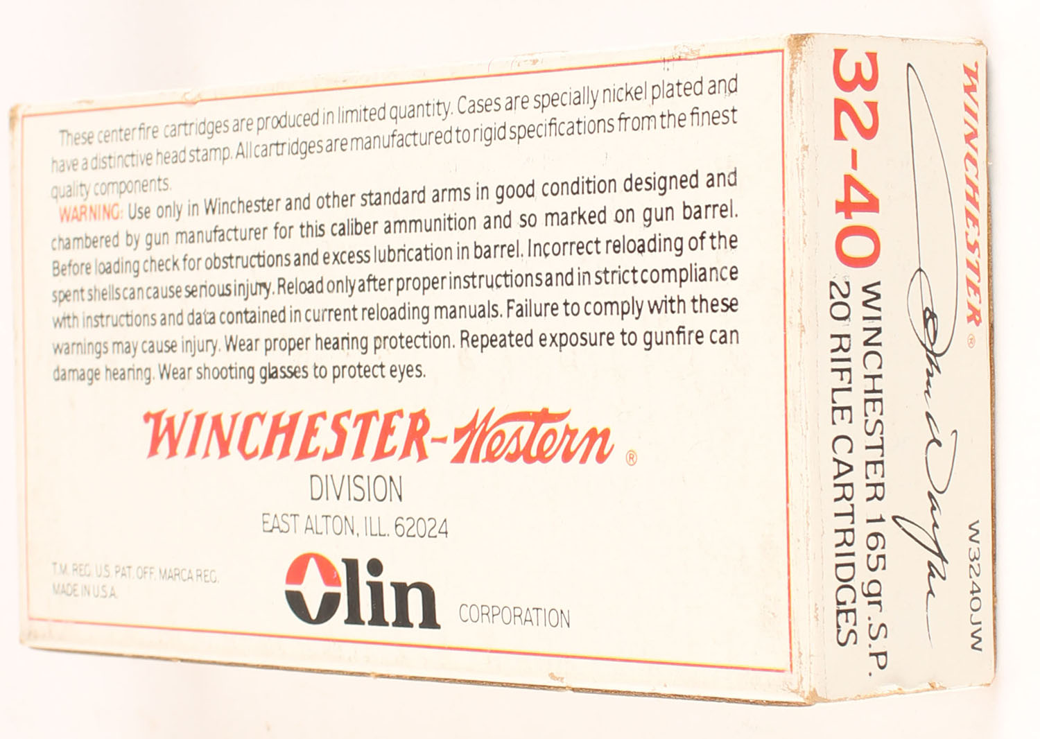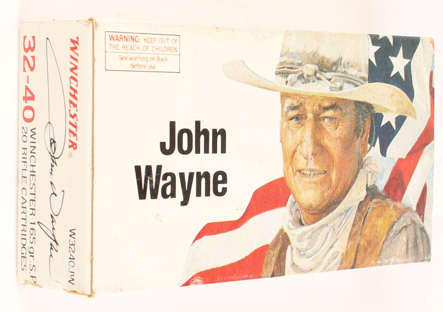 Winchester, John Wayne, .32-40 Winchester, 165 Grain Soft Point, Full, 1pc. White box featuring John Wayne, box is solid with excellent color, very minor corner wear, edges are mostly crisp, end flaps are solid, ammo is minty. Grade: Excellent + - Value: 80 to 120