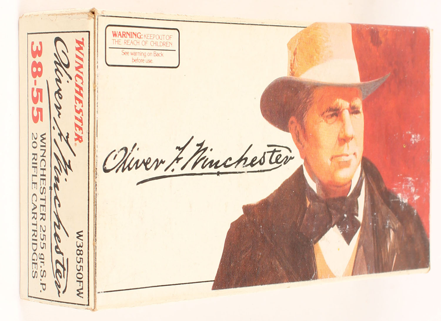 Winchester, Oliver F. Winchester, .38-55 Winchester, 255 Grain Soft Point, Full, 1pc. White box picturing Oliver Winchester, box is solid with excellent color, minor shelf wear, very minor corner wear, edges are crisp, end flaps are solid, ammo is minty. Grade: Excellent - Value: 50 to 75