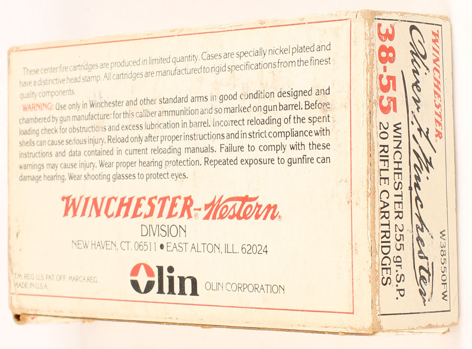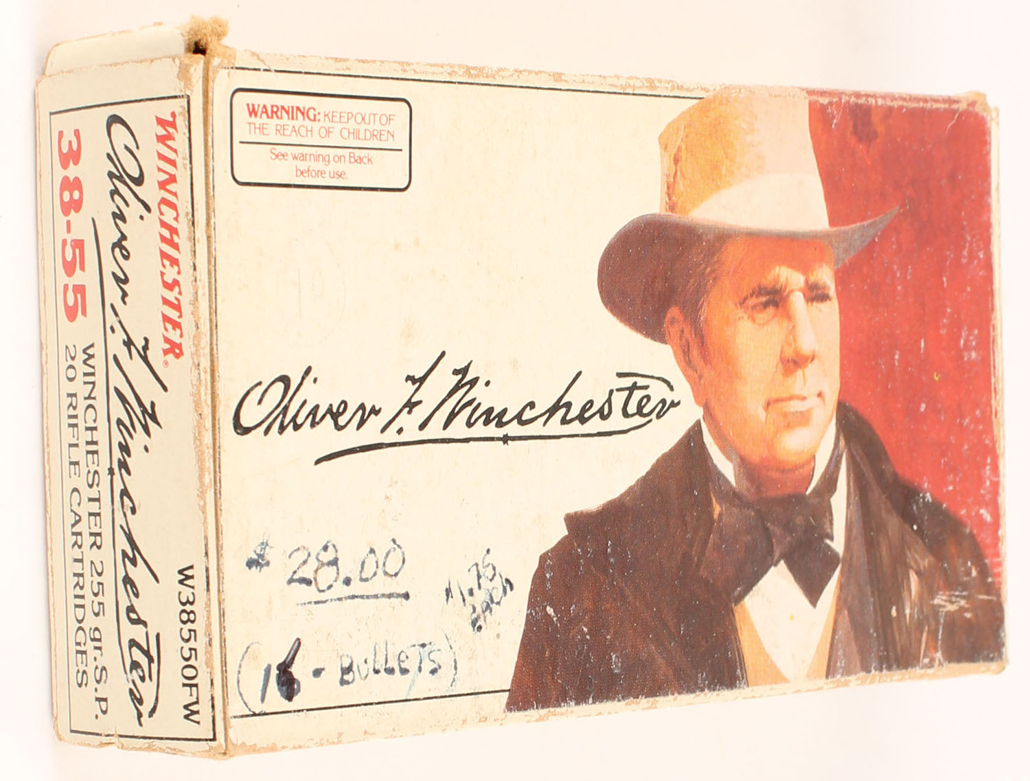 Winchester, Oliver F. Winchester, .38-55 Winchester, 255 Grain Soft Point, Partial 16rds., 1pc. White box picturing Oliver Winchester, box is solid with very good color, some age soiling & shelf wear, some edge & corner wear, top has been written on, end flaps are solid, ammo is excellent. Grade: Very Good - Value: 30 to 45