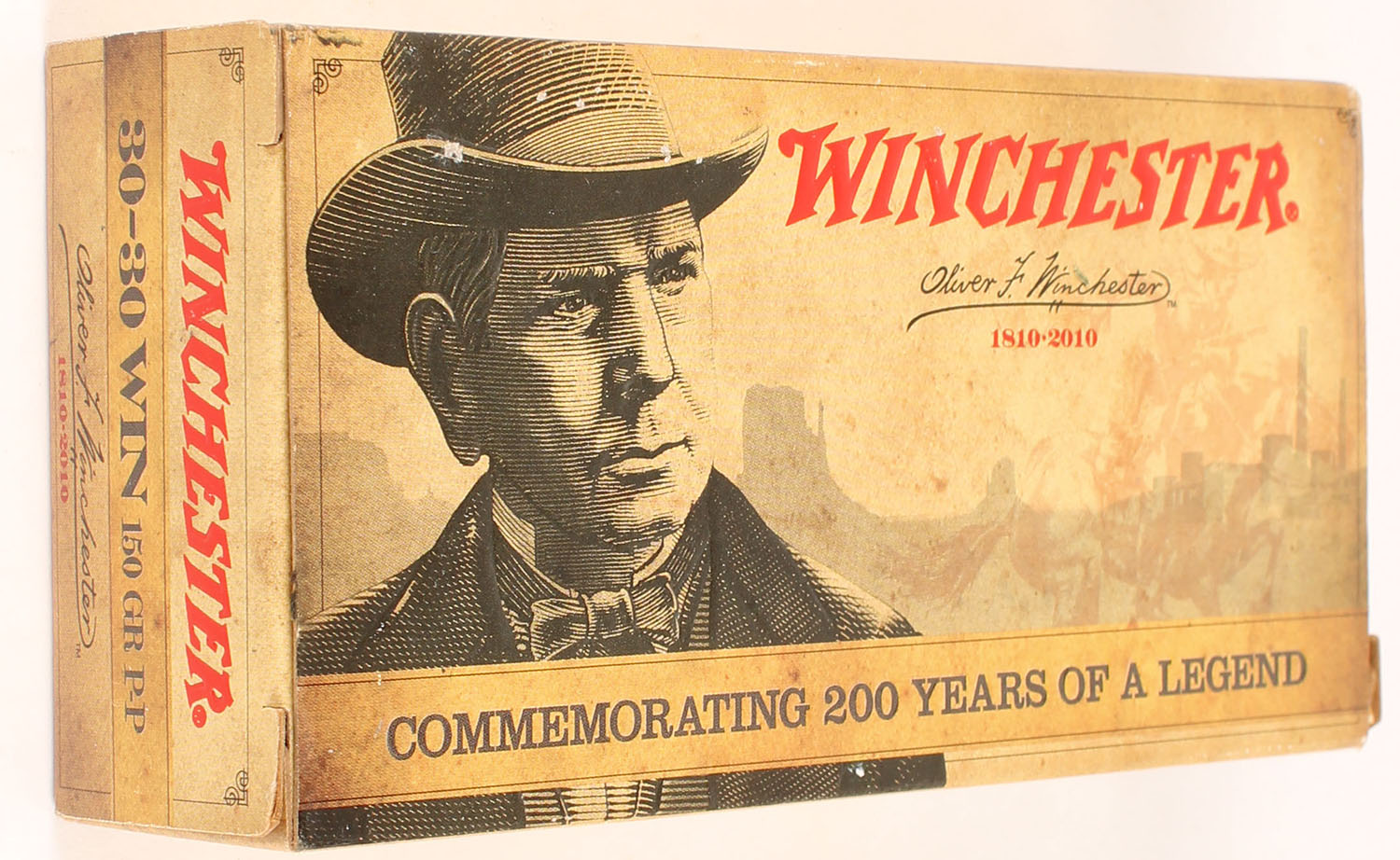 Winchester, Oliver F. Winchester 1810-2010, Commemorating 200 Years of a Legend, .30-30 Win. 150 Gr. Power-Point., Full, 1pc. Brown box featuring a portrait of Oliver Winchester, box is near mint with minty color, only very minor shelf wear, corners are mostly sharp, edges are crisp, end flaps are solid, ammo is minty. Grade: Excellent ++ - Value: 50 to 75