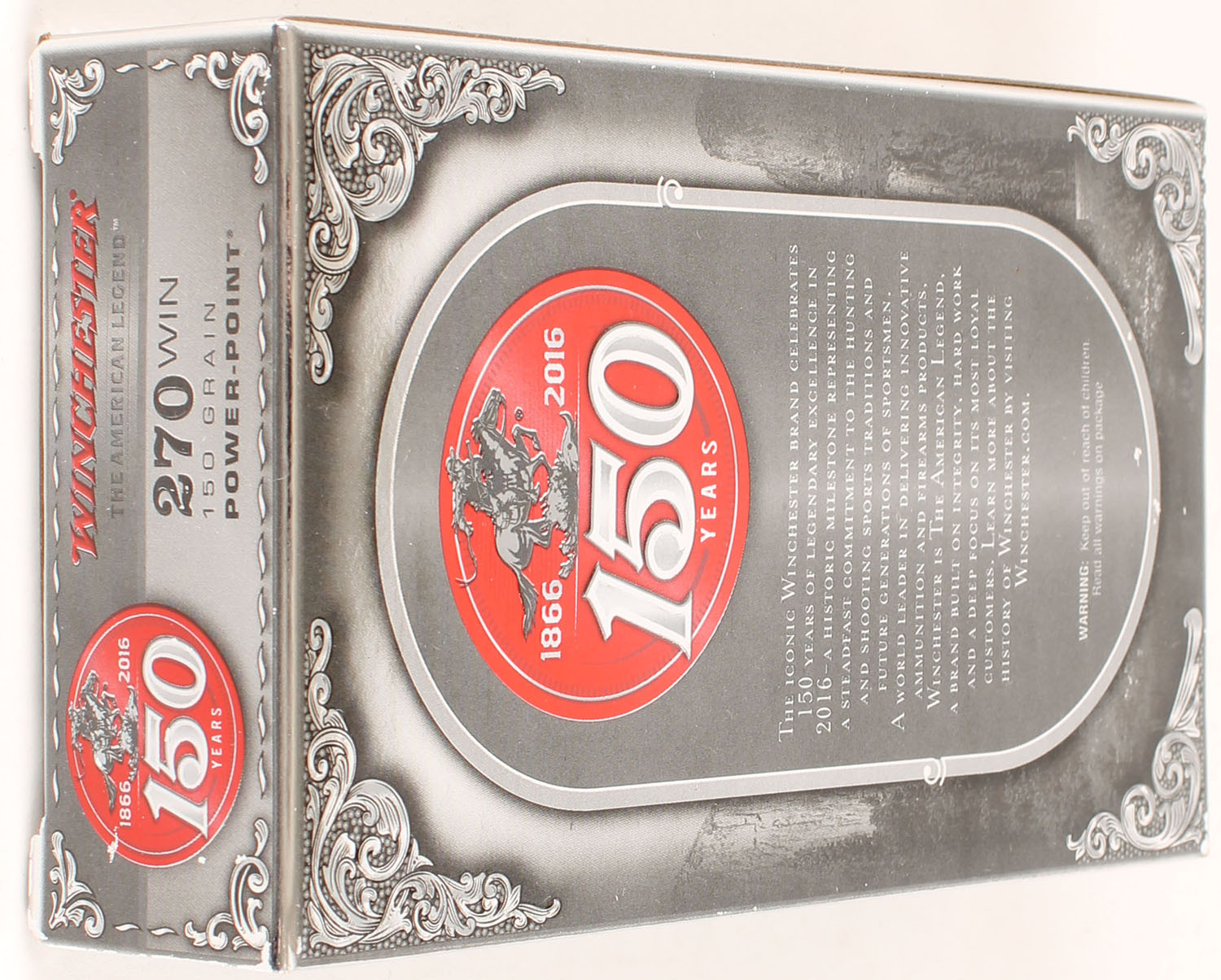 Winchester, The American Legend, 150 Year Commemorative box, .270 Winchester, 150 Grain Power-Point, Full, 1pc. Silver & red box, box is MINT with minty color, corners are sharp, edges are crisp, end flaps are solid, ammo is minty. Grade: MINT - Value: 70 to 100