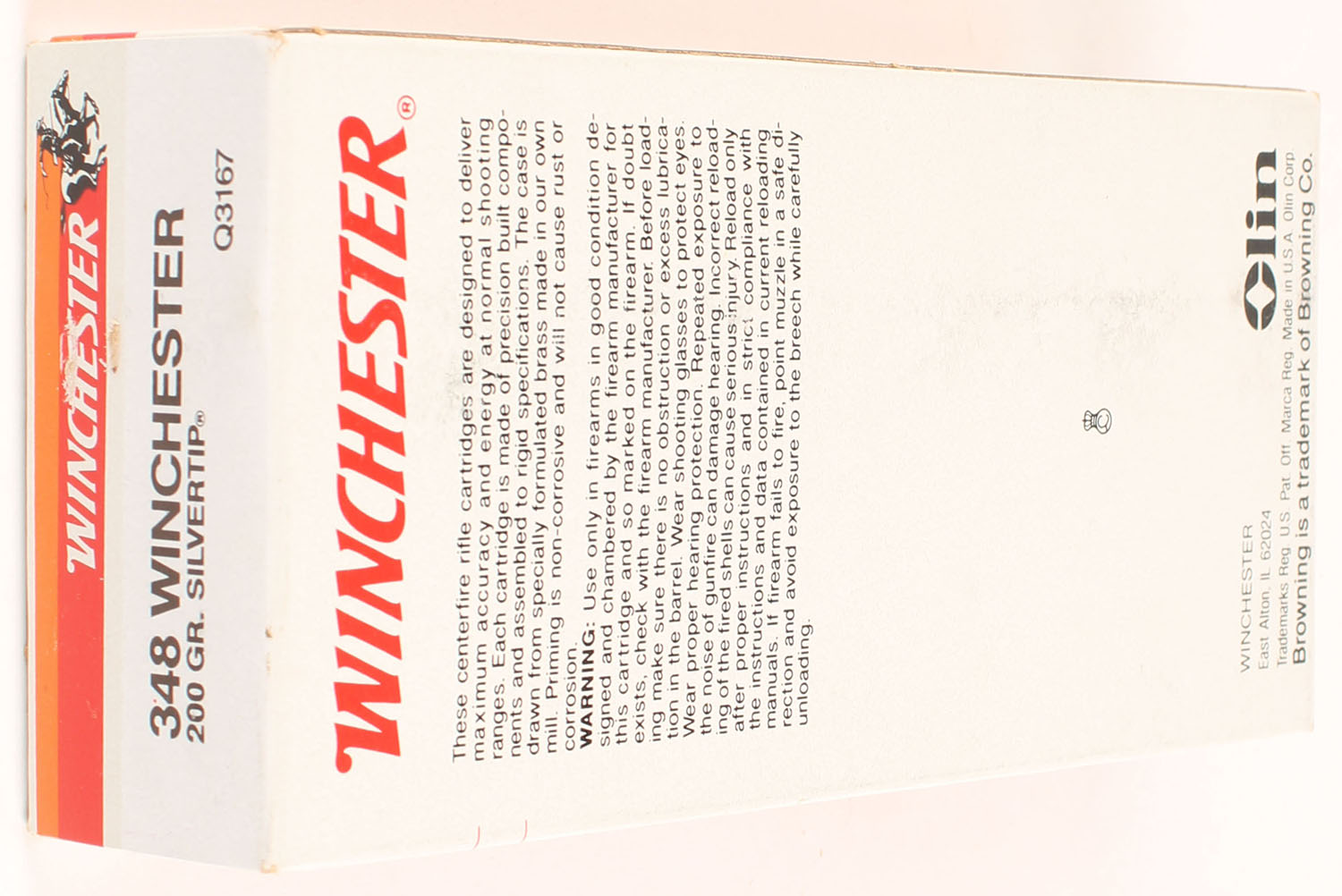 Winchester, Browning Model '71 Commemorative Box, .348 Winchester, 200 Grain Silvertip, Full, 1pc. Multi-colored box featuring a model 71, box is near mint with minty color, only very minor shelf wear, corners are sharp, edges are crisp, end flaps are solid, ammo is excellent. Grade: Excellent ++ - Value: 80 to 120