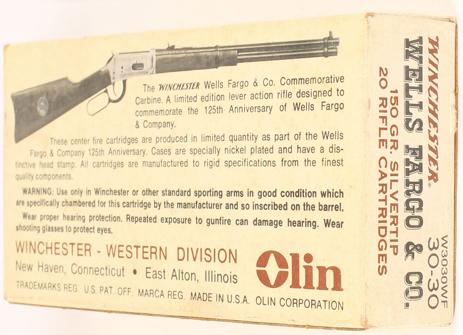 Winchester, Wells Fargo & Co., .30-30 Winchester, 150 Gr. Silvertip, Partial 19rds., 1pc. Tan brown & black box, box is solid with excellent color, very minor age soiling & corner wear, edges are crisp, end flaps are solid, ammo is minty. Grade: Excellent - Value: 48 to 72