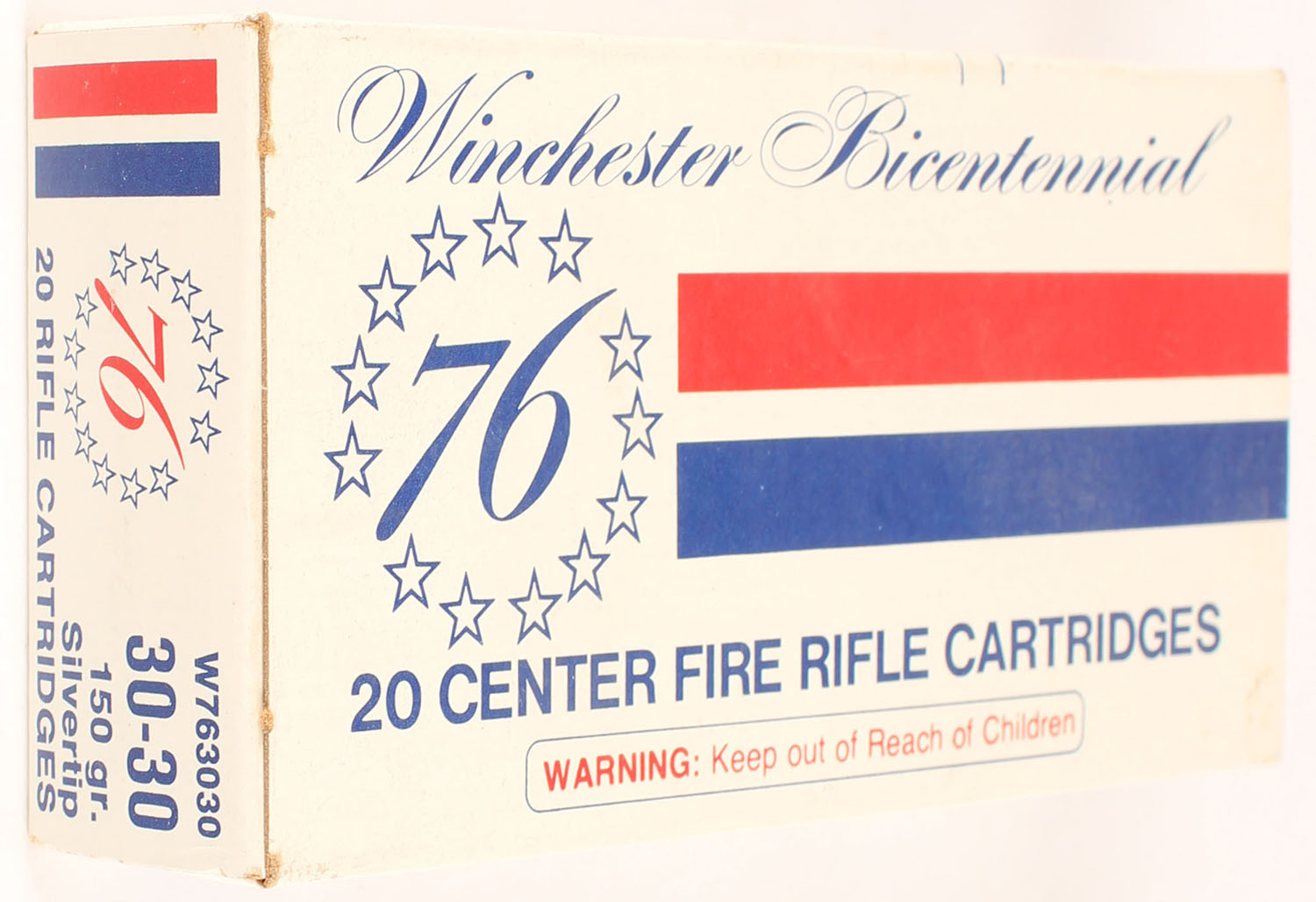 Winchester, Bicentennial, .30-30 Winchester, 150 Gr. Silvertip, Full, 1pc. White blue & red box, box is solid with excellent color, very minor corner wear, edges are crisp, end flaps are solid, ammo is minty. Grade: Excellent ++ - Value: 40 to 60