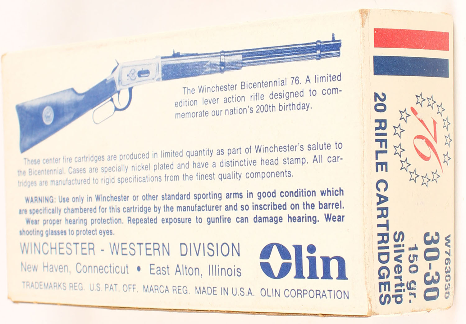 Winchester, Bicentennial, .30-30 Winchester, 150 Gr. Silvertip, Full, 1pc. White blue & red box, box is solid with very good color, some color fading on top, sticker residue on top, minor corner wear, edges are crisp, end flaps are solid, ammo is minty. Grade: Very Good ++ - Value: 36 to 52