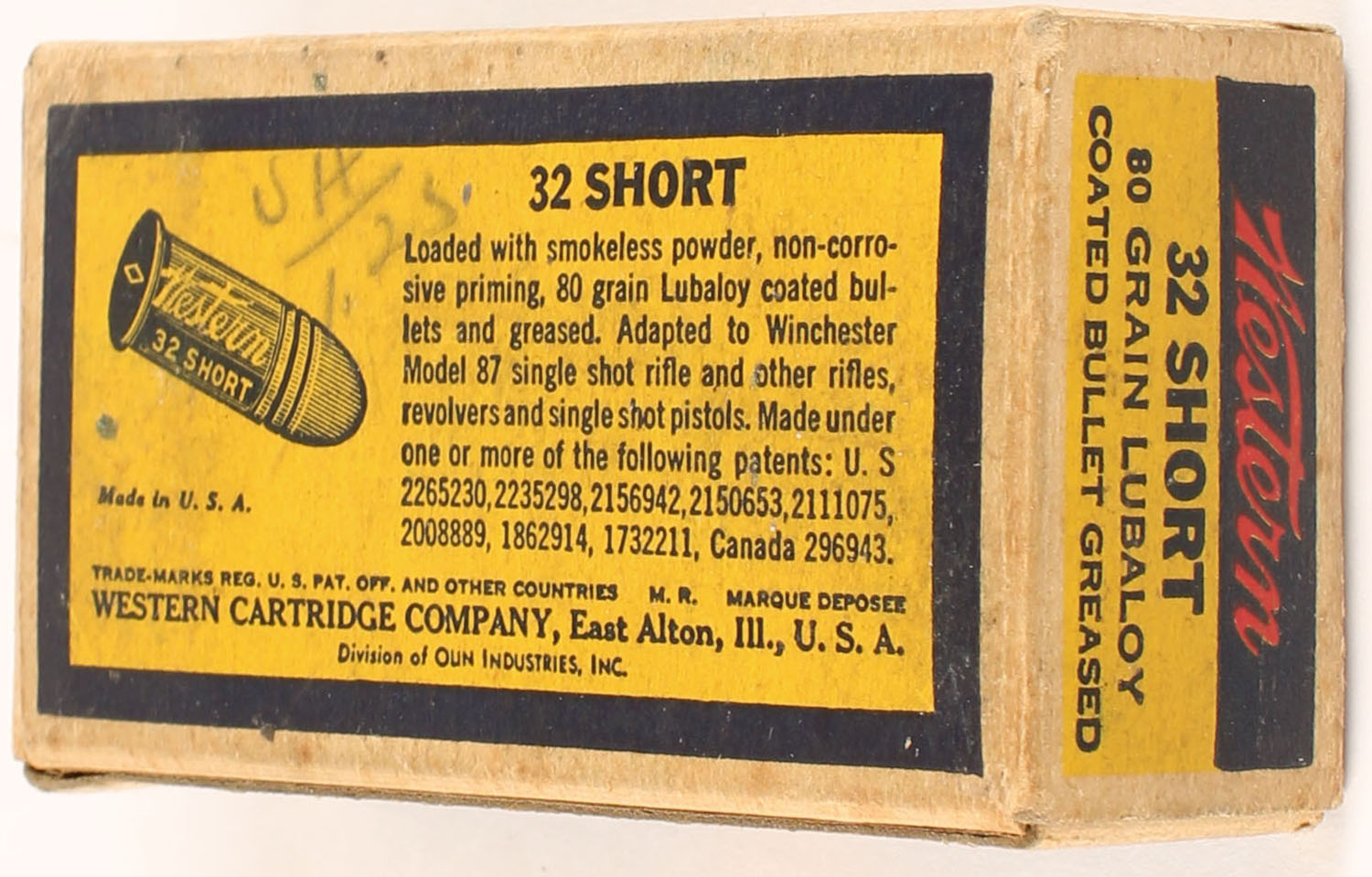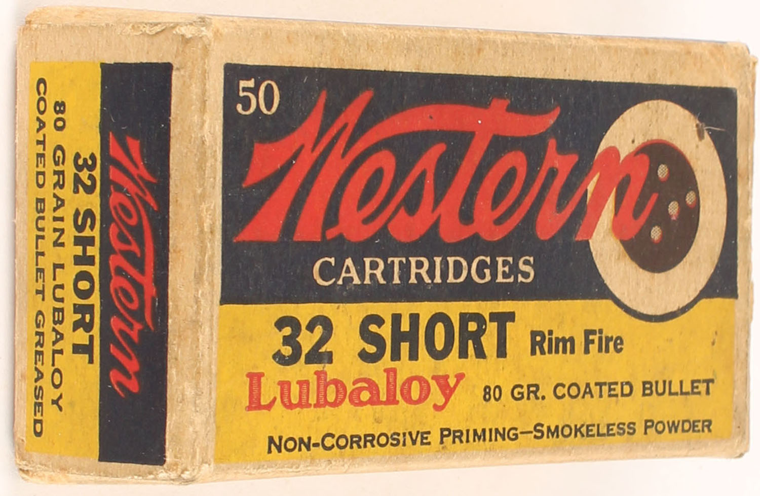 Western, Lubaloy Cartridges, .32 Short Rim Fire, 80 Grain Coated Bullet, Full, 1pc. Yellow blue & red bulls eye box, box is solid with very good color, some age soiling, minor corner wear, edges are mostly crisp, end flaps are solid, ammo is very good. Grade: Very Good ++ - Value: 120 to 180