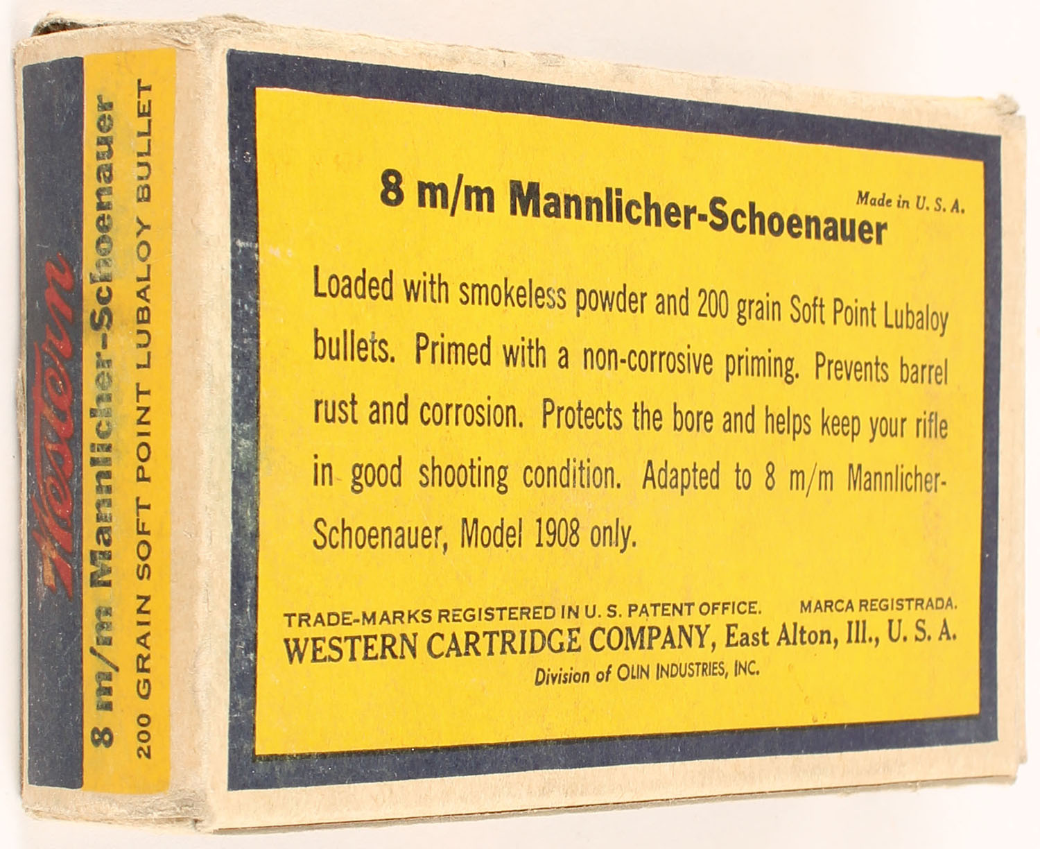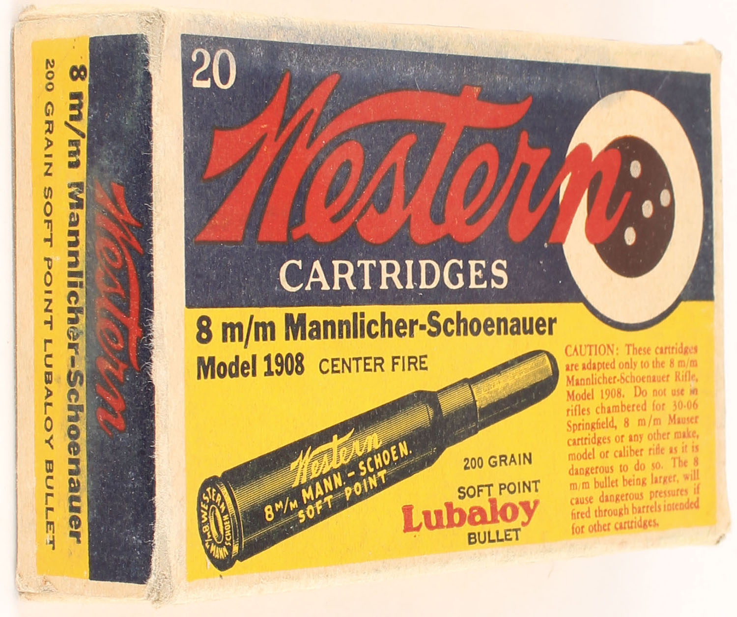 Western, Lubaloy Cartridges, 8mm Mannlicher-Schoenauer, 200 Grain Soft Point Bullet, Full, 1pc. Yellow blue & red bulls eye box, box is solid with very good to excellent color, minor age soiling & edge wear, some corner wear, end flaps are solid, ammo is excellent. Grade: Excellent - Value: 20 to 30