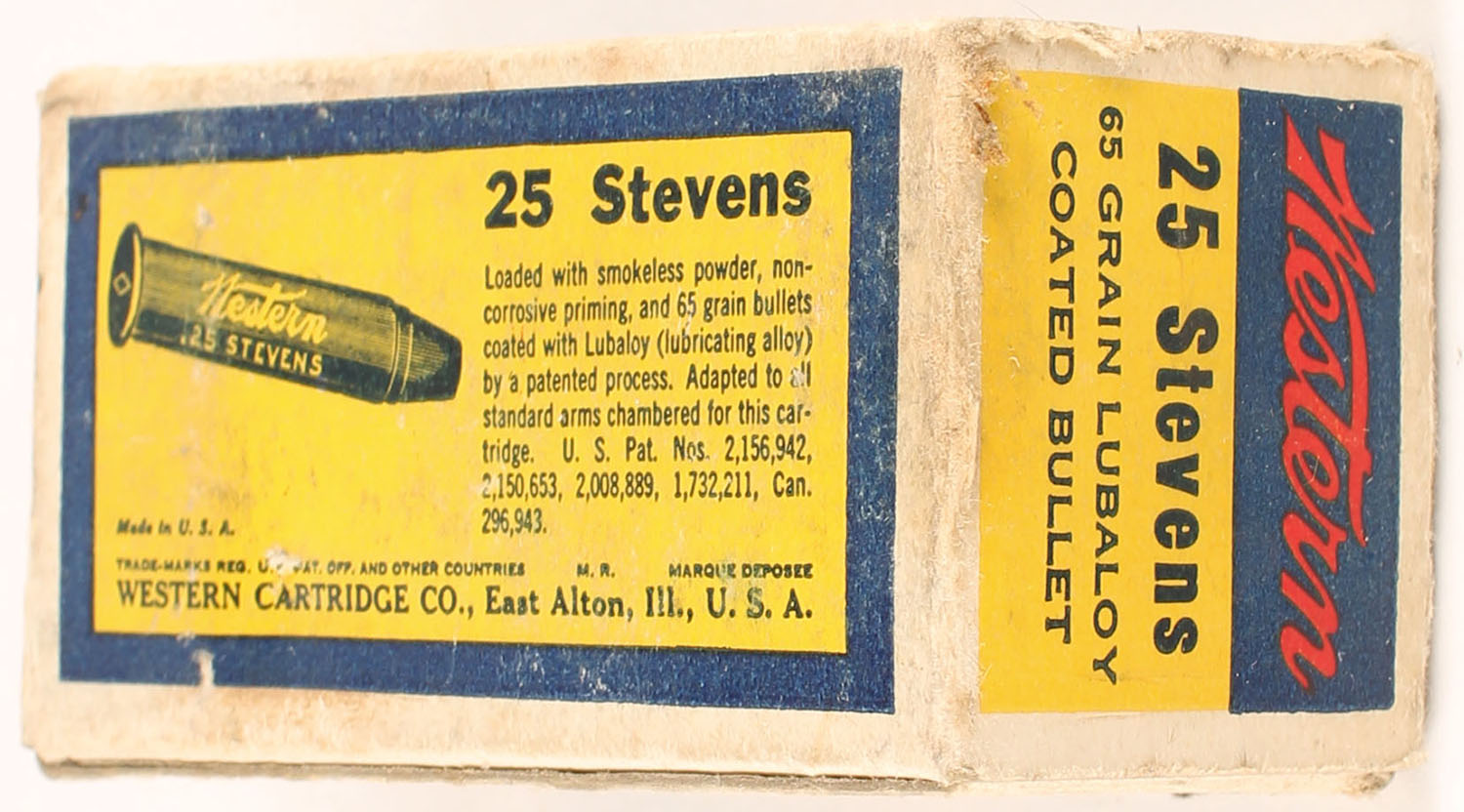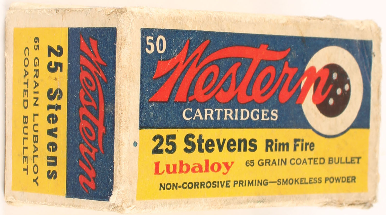 Western, Lubaloy Cartridges, .25 Stevens Rim Fire, 65 Grain Coated Bullet, Partial 46rds. 1pc. Yellow blue & red bulls eye box, box is solid with excellent color, partial seam split to top front edge, corner wear, some edge wear, end flaps are solid, ammo is excellent. Grade: Very Good ++ - Value: 120 to 180