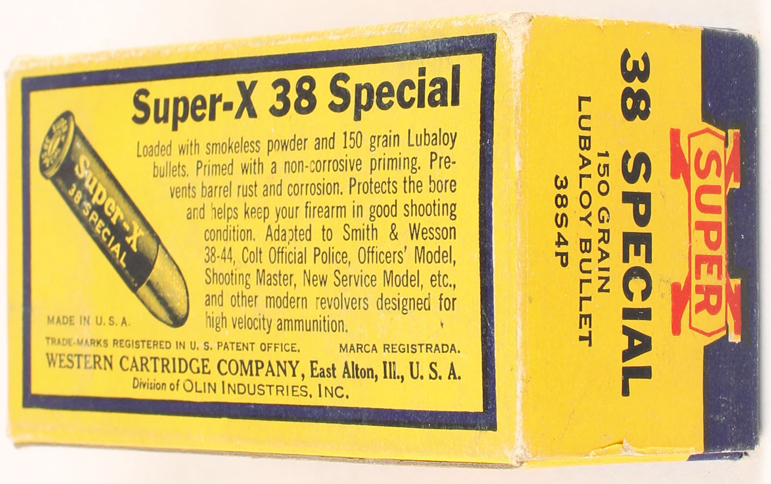 Western, Super-X, .38 Special, 150 Grain Lubaloy Bullet, Full, 1pc. Yellow blue & red box, box is solid with excellent color, minor corner wear, edges are mostly crisp, end flaps are solid, ammo is minty. Grade: Excellent + - Value: 50 to 75