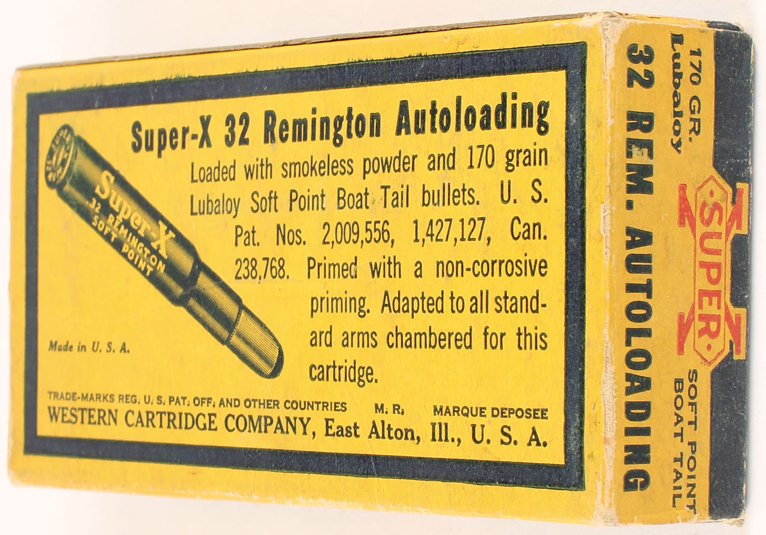 Western, Super-X, .32 Remington Autoloading, 170 Grain Boat Tail Soft Point Bullet, Full, 1pc. Yellow blue & red box, box is solid with very good color, minor age soiling & color fading, minor edge & corner wear, end flaps are solid, ammo is excellent. Grade: Very Good ++ - Value: 36 to 54
