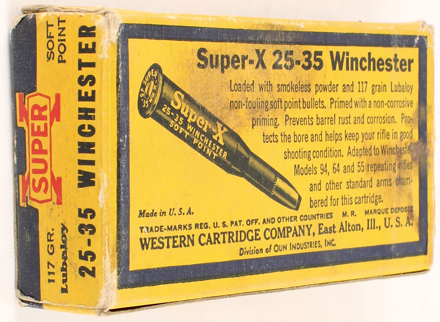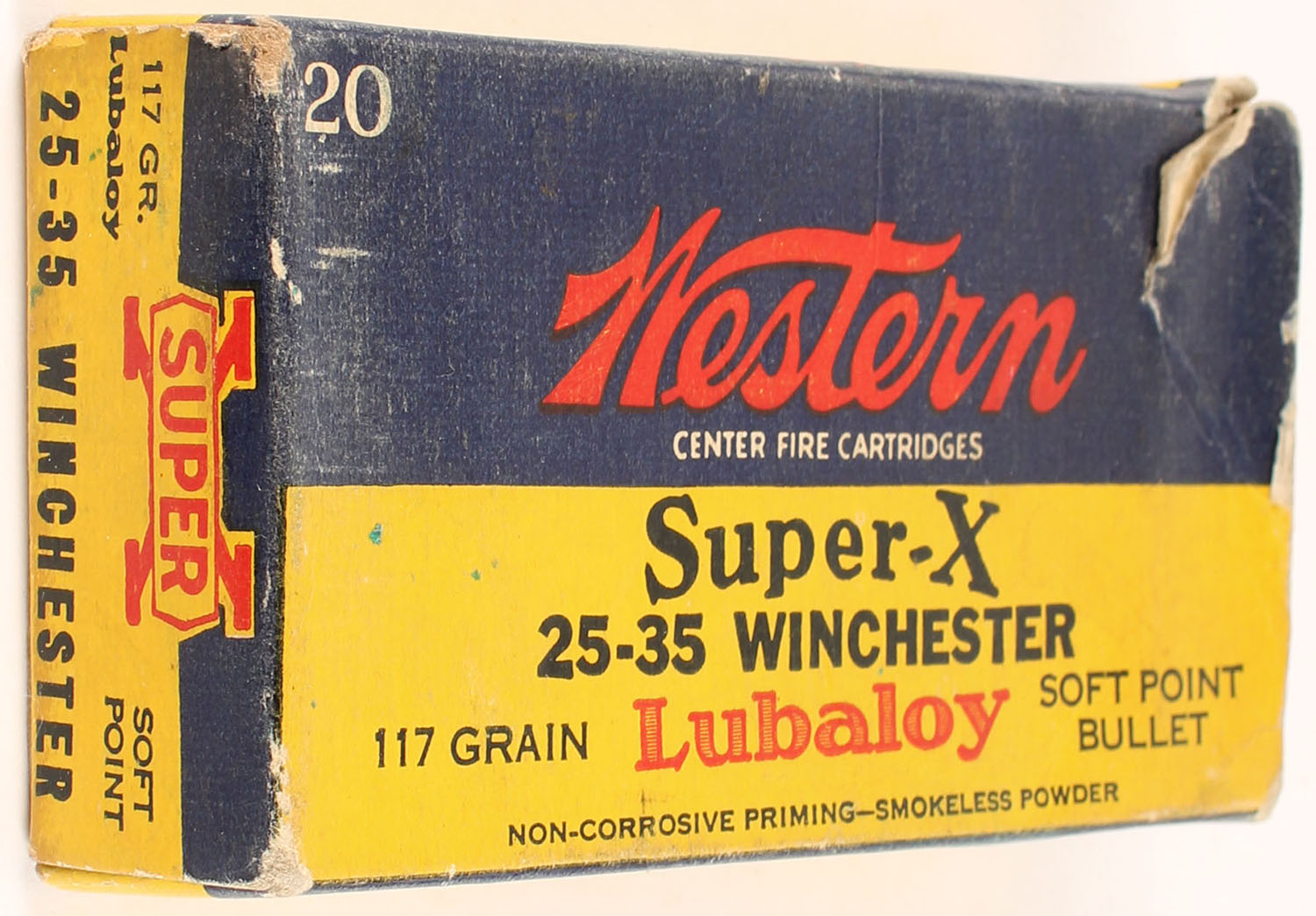 Western, Super-X, .25-35 Winchester, 117 Grain Soft Point Lubaloy Bullet, Full (16rds. Correct, 4rds. Incorrect), 1pc. Yellow blue & red box, box is solid with excellent color, tear on top, some corner wear, minor edge wear, end flaps are solid, ammo is very good. Grade: Very Good + - Value: 36 to 54
