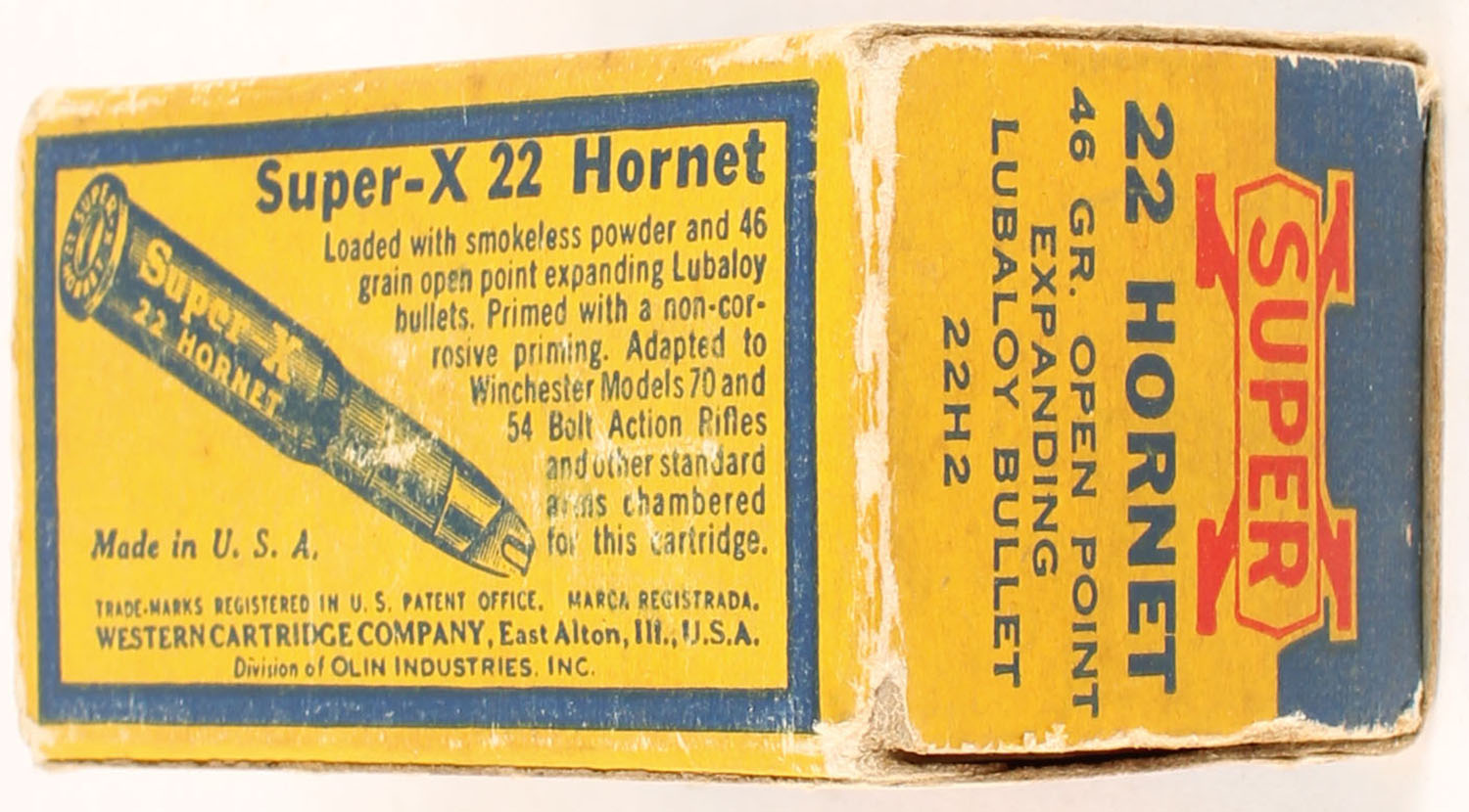 Western, Super-X, .22 Hornet, 46 Grain Open Point Expanding Lubaloy Bullet, Full of Incorrect ammo (REM-UMC H/S, Soft Point Bullet), 1pc. Yellow blue & red box, missing left end flap, very good color, some age soiling, edge & corner wear, top has been written on, right end flap is solid, ammo is very good to excellent. Grade: Good + - Value: 30 to 45