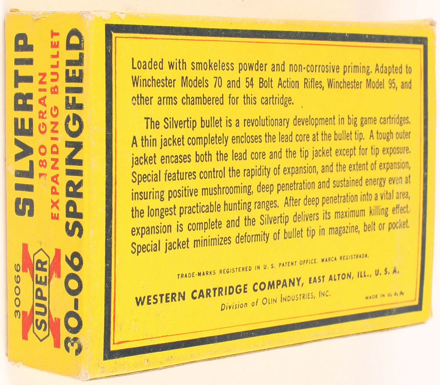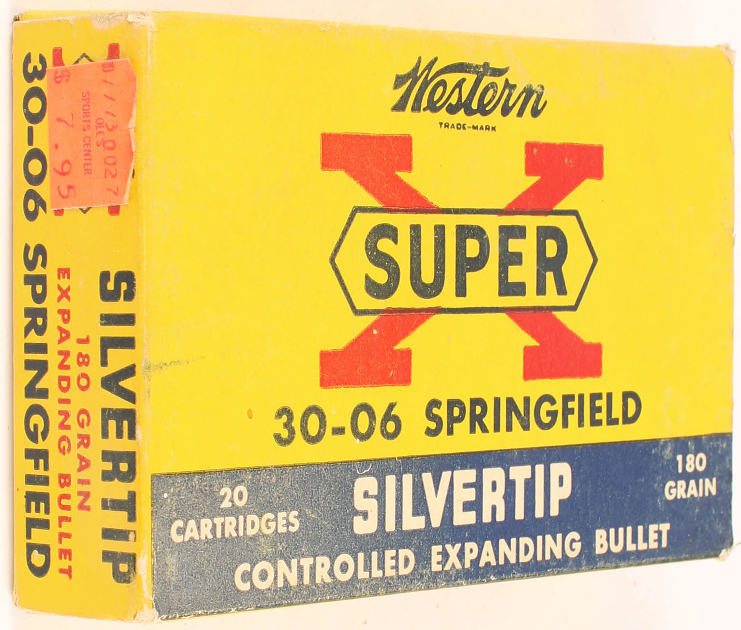 Western, Super X Silvertip, .30-06 Springfield, 180 Grain Controlled Expanding Bullet, Full, 1pc. Yellow blue & red box, box is solid with excellent color, minor color fading, very minor corner wear, edges are crisp, end flaps are solid, ammo is excellent. Grade: Excellent. Grade: Excellent - Value: 36 to 54