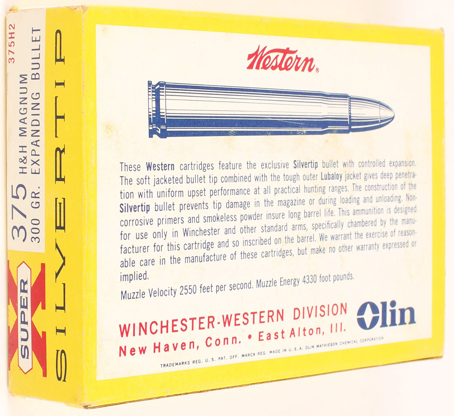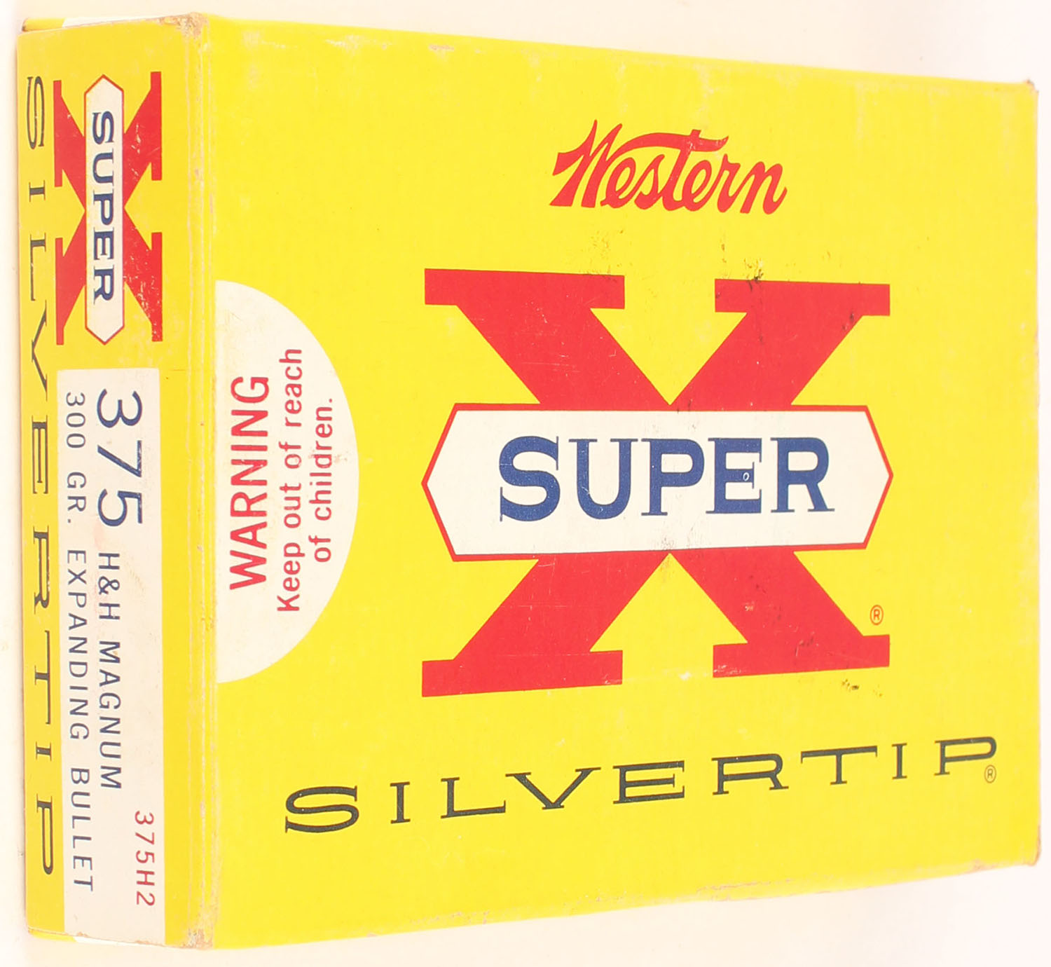 Western, Super X Silvertip, .375 H&H Magnum, 300 Grain Expanding Bullet, Full, 1pc. Yellow white & red box, box is solid with excellent to minty color, very minor shelf wear, very minor edge & corner wear, end flaps are solid, ammo is excellent. Grade: Excellent ++ - Value: 50 to 75