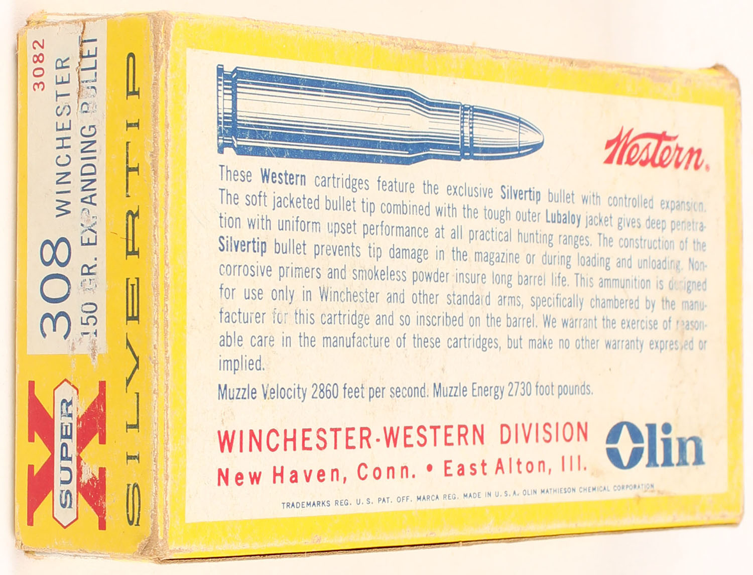 Western, Super X Silvertip, .308 Winchester, 150 Grain Expanding Bullet, Full, 1pc. Yellow white & red box, box is solid with excellent color, some edge & corner wear, end flaps are solid, ammo is excellent. Grade: Excellent - Value: 24 to 36