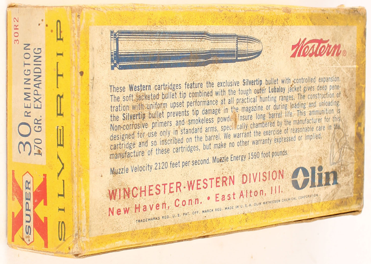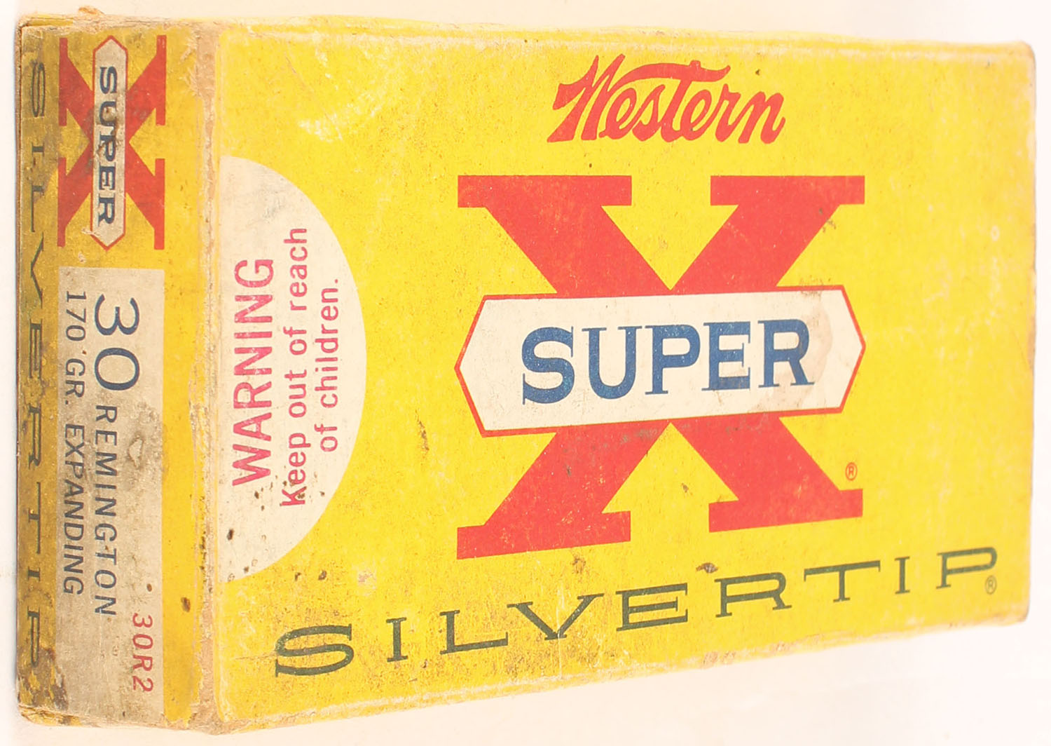 Western, Super X Silvertip, .30 Remington, 170 Grain Expanding Bullet, Full, 1pc. Yellow white & red box, box is solid with good to very good color, age soiling, some shelf & corner wear, minor edge wear, end flaps are solid, ammo is excellent. Grade: Very Good - Value: 50 to 75