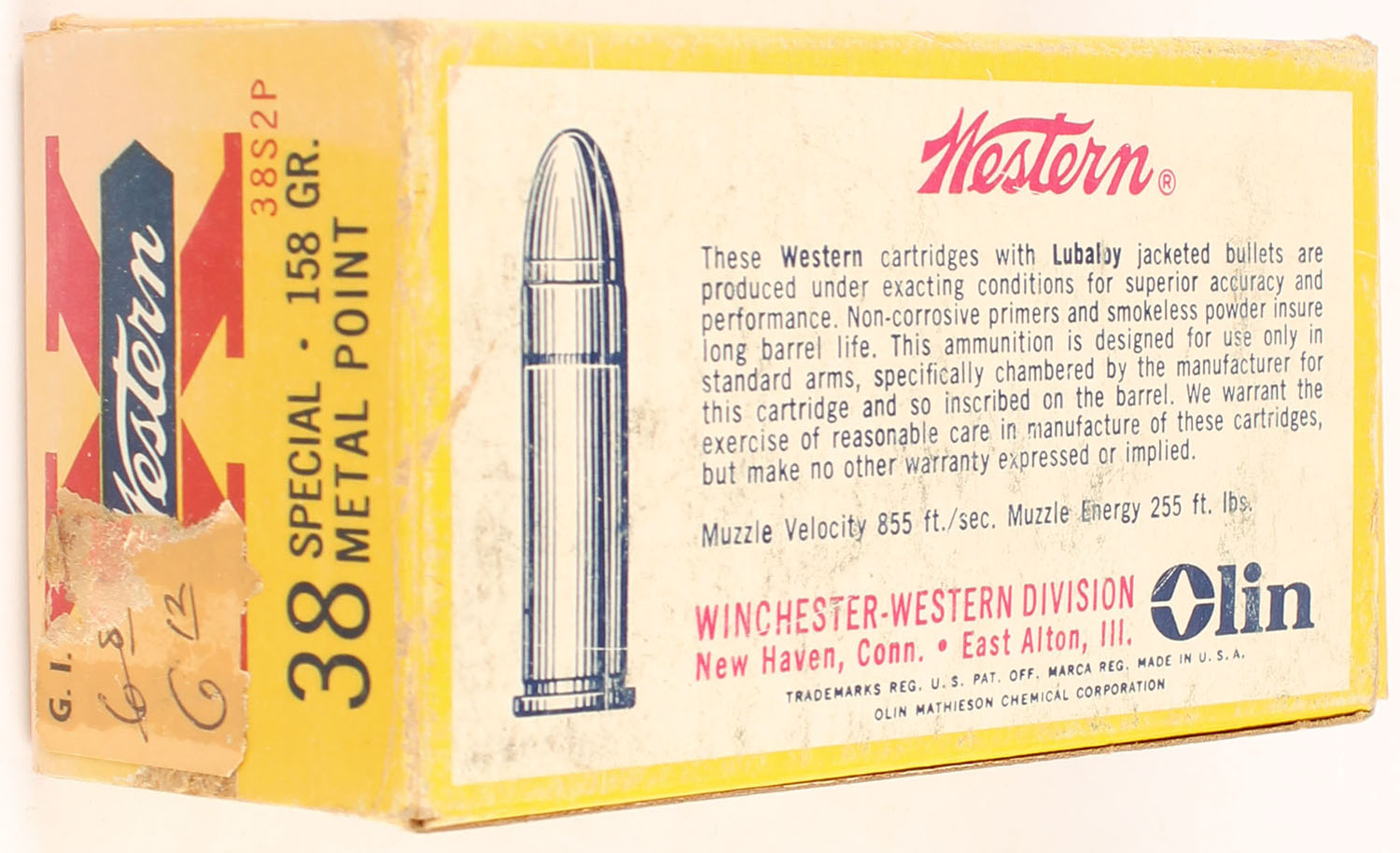 Western, X, .38 Special, 158 Grain Metal Point, Full, 1pc. Yellow white & red box, box is solid with good color, color fading on top, very minor corner wear, edges are crisp, end flaps are solid, ammo is excellent. Grade: Very Good - Value: 24 to 36
