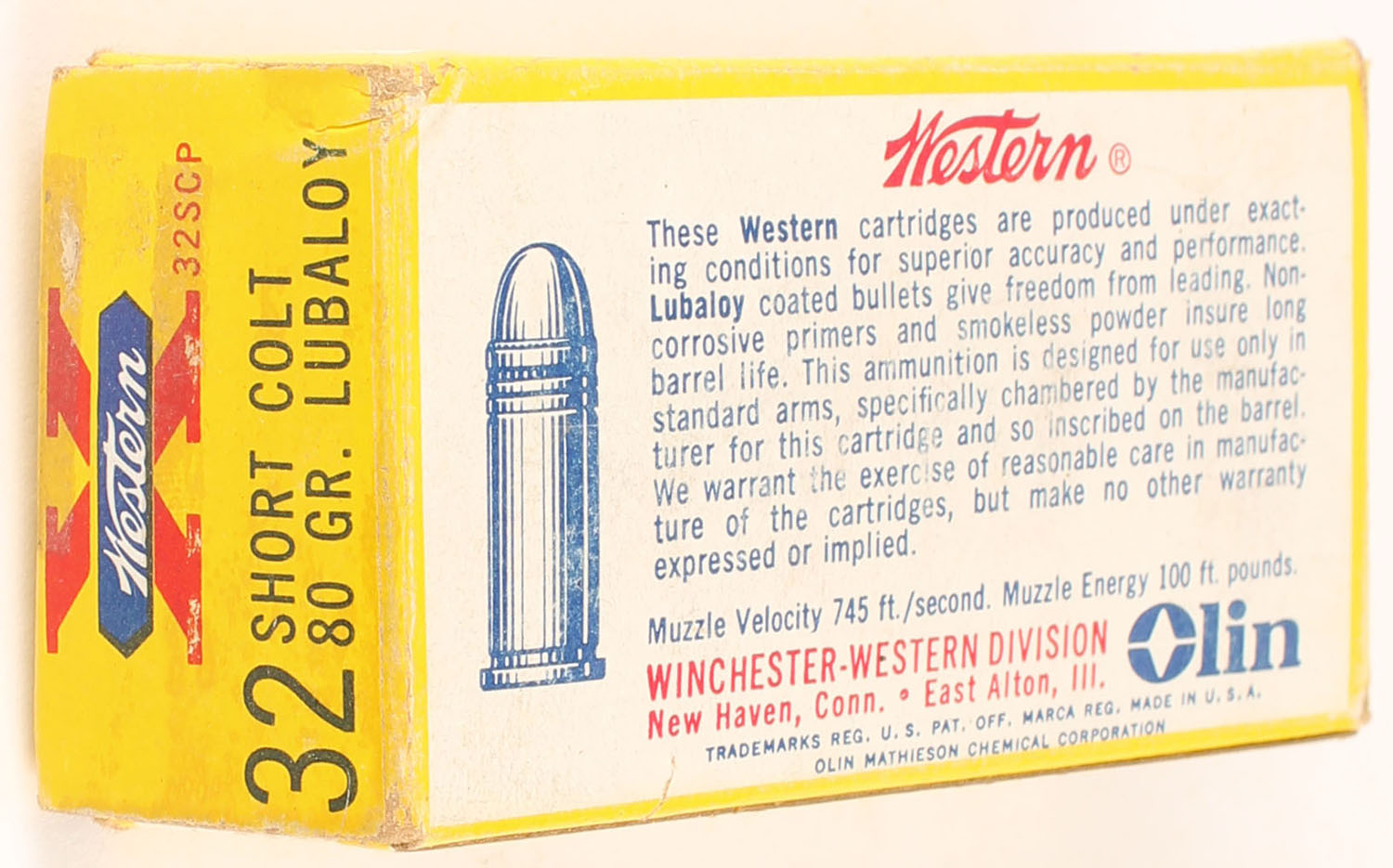 Western, X, .32 Short Colt, 80 Grain Lubaloy, Partial 34rds. 1pc. Yellow white & red box, box is solid with excellent color, some edge & corner wear, end flaps are solid, ammo is excellent. Grade: Very Good ++ - Value: 30 to 45