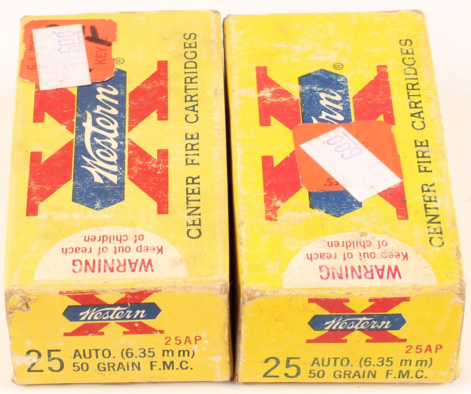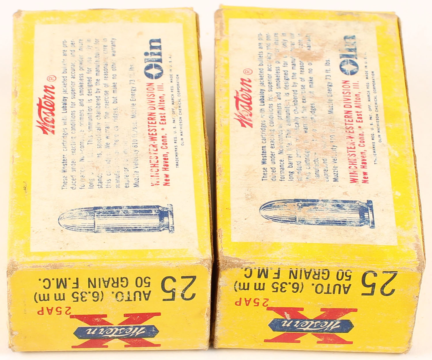 Western, Lot of (2) X, .25 Automatic (6.35mm), 50 Grain Full Metal Case, (1) box full & correct, (1) box partial 44rds. Of mixed ammo, boxes are solid with very good color, some shelf & corner wear, minor edge wear, end flaps are solid, ammo is excellent. Grade: Very Good ++ - Value: 60 to 90