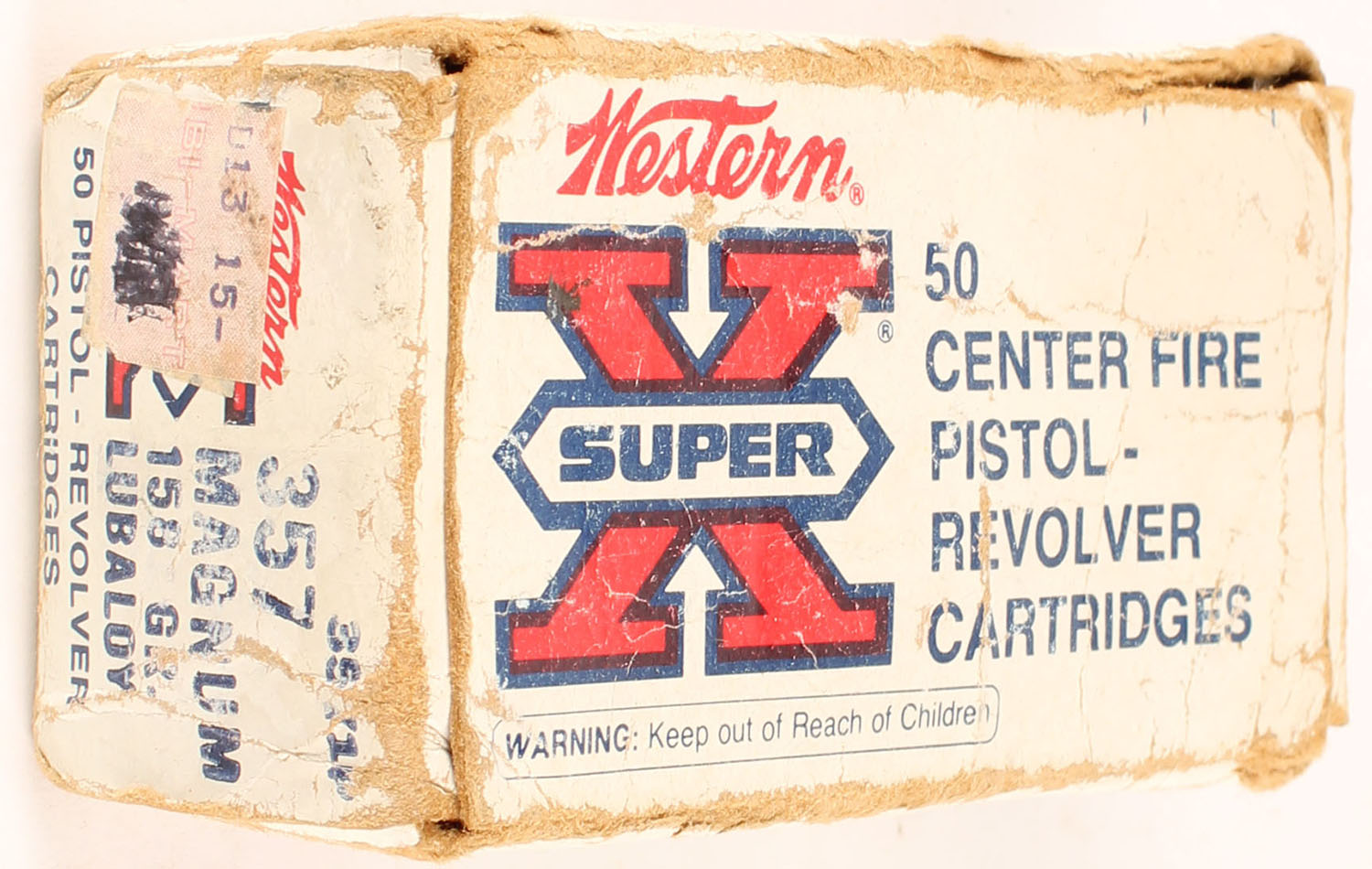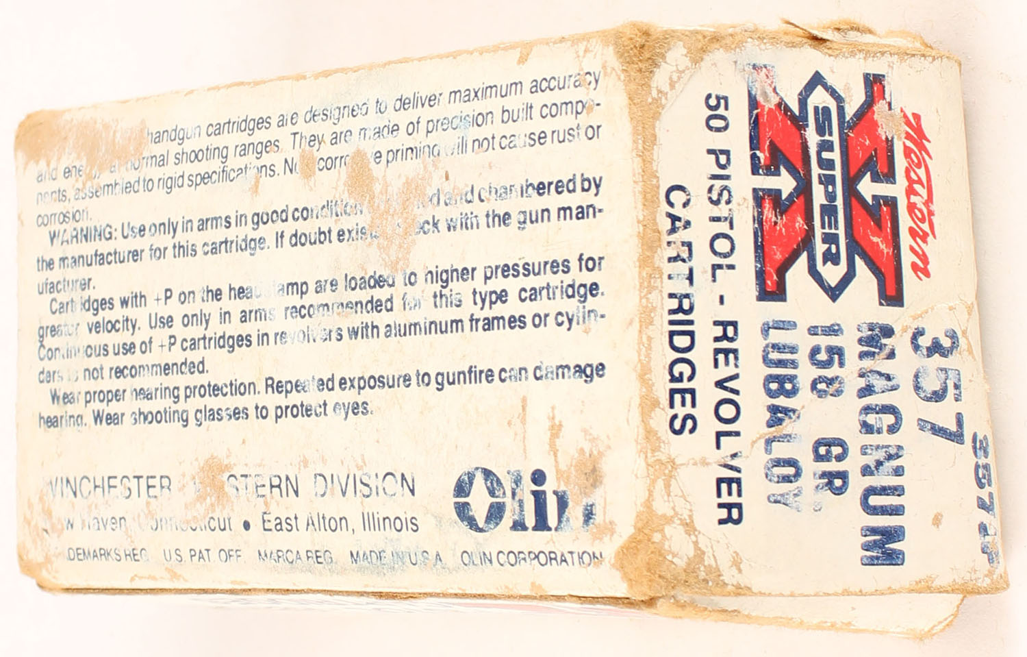 Western, Super X, 158 Grain Lubaloy, Full of mixed ammo (mostly correct), 1pc. White red & black box, box is solid with very good color, shelf wear, edge & corner wear, partial seam split to back edge, end flaps are solid, ammo is excellent. Grade: Good - Value: 12 to 18