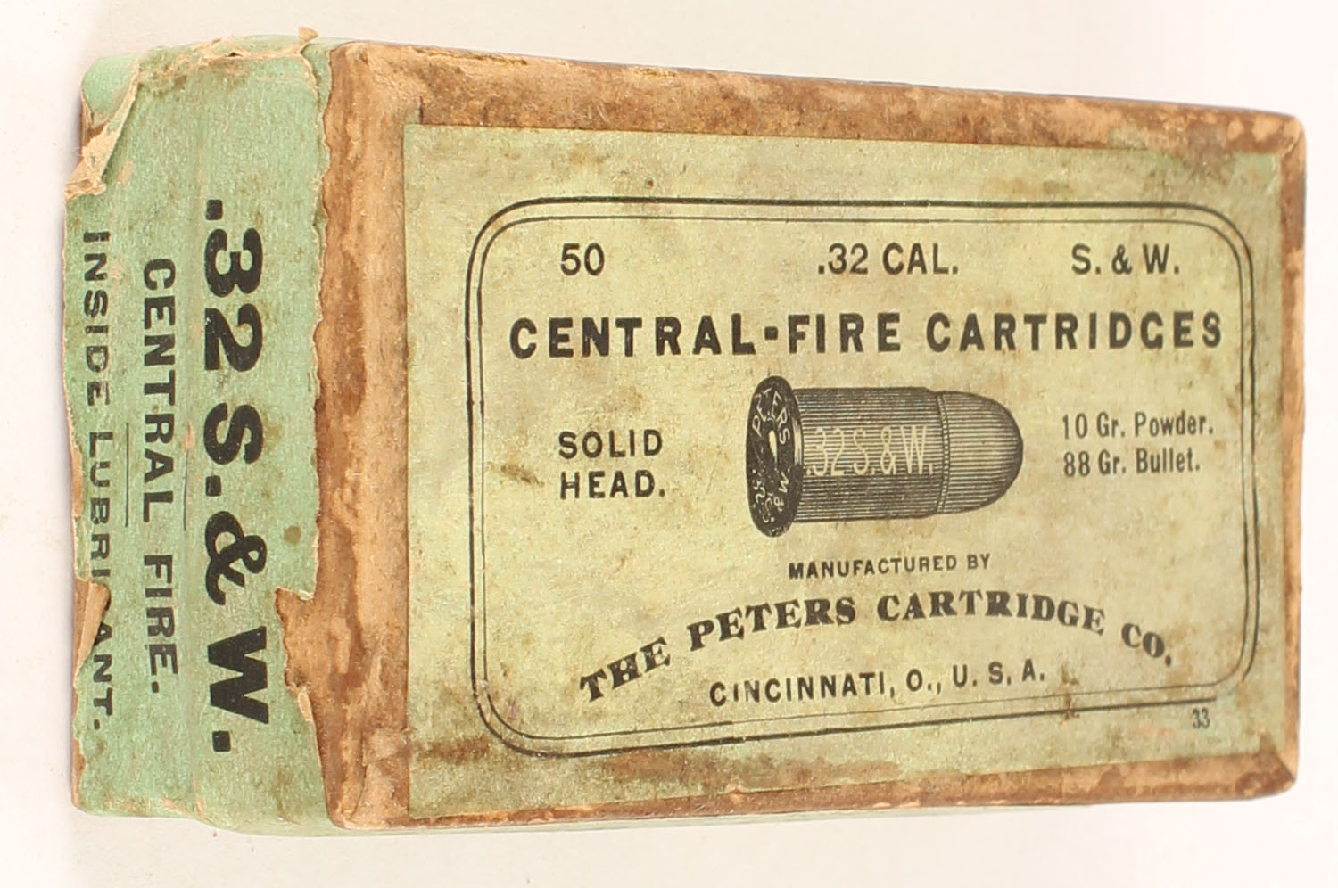 Peters, Central-Fire Cartridges, .32 Smith & Wesson, 88 Grain Solid Head Bullet, FULL & SEALED, 2pc. Buff box with green top & side sealing labels, box is solid with very good color, age soiling, some edge & corner wear, labels are intact. Grade: Very Good + - Value: 24 to 36