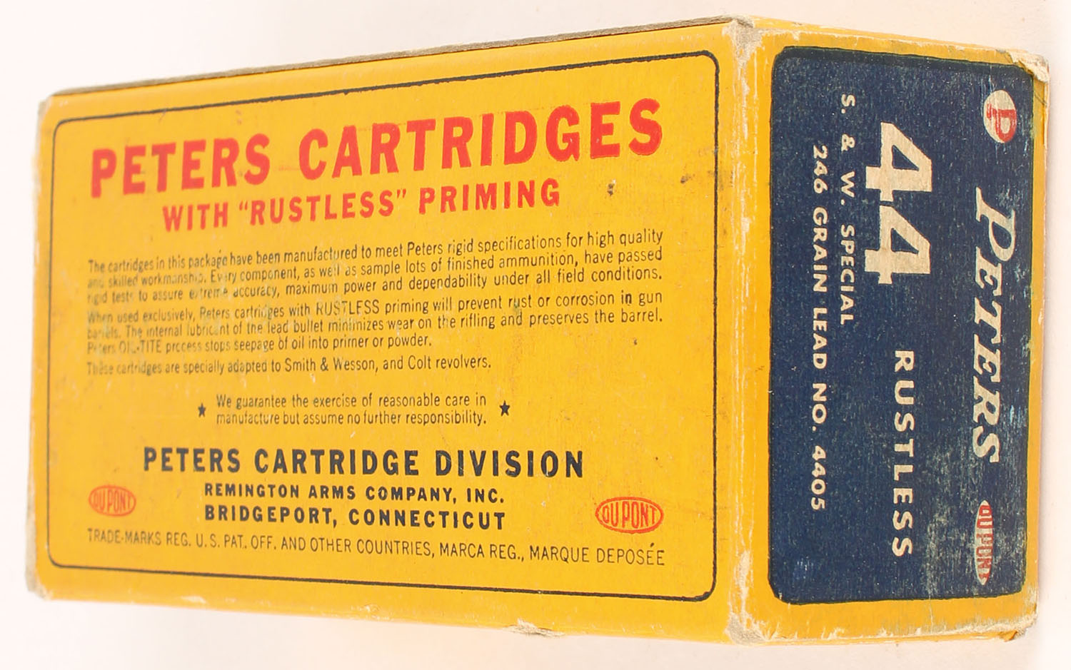 Peters, Rustless, .44 Smith & Wesson Special, 246 Grain Lead Bullet, Full, 1pc. Blue yellow & red box, box is solid with excellent color, minor shelf wear, some edge & corner wear, end flaps are solid, ammo is very good. Grade: Very Good ++ - Value: 40 to 60