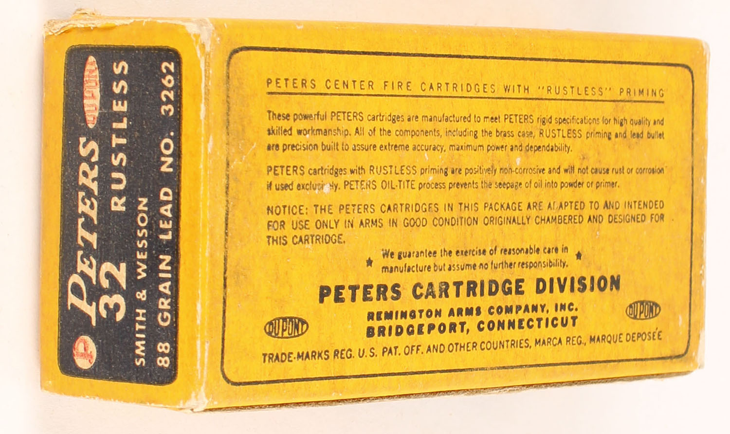 Peters, Rustless, .32 Smith & Wesson, 88 Grain Lead Bullet, Partial 49rds., 1pc. Blue yellow & red box, box is solid with very good color, some color fading, tear on top, very minor corner wear, edges are mostly crisp, end flaps are solid, ammo is excellent. Grade: Very Good - Value: 20 to 30