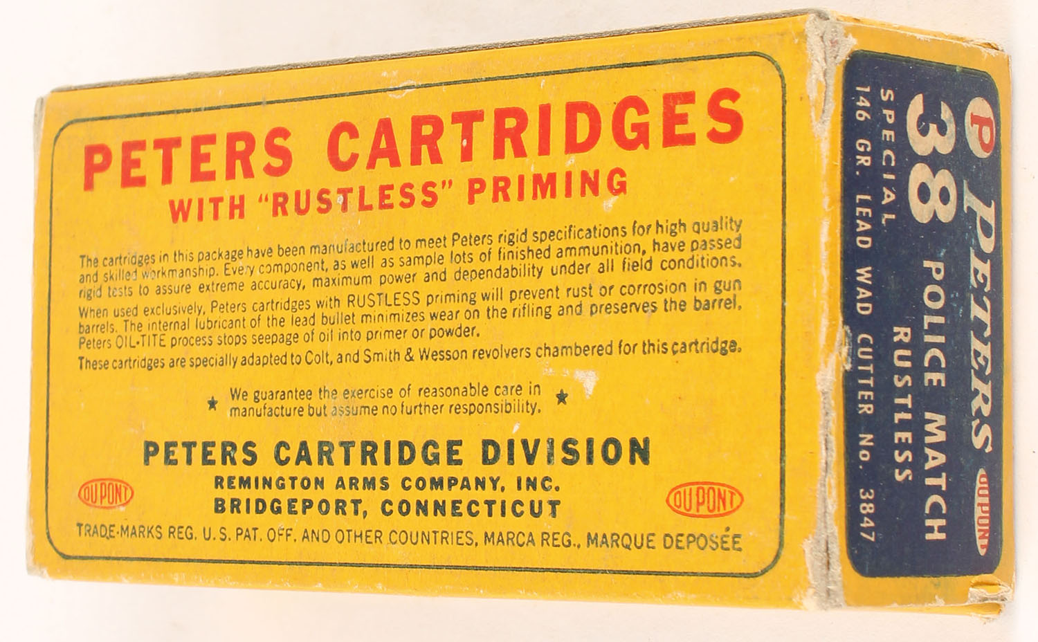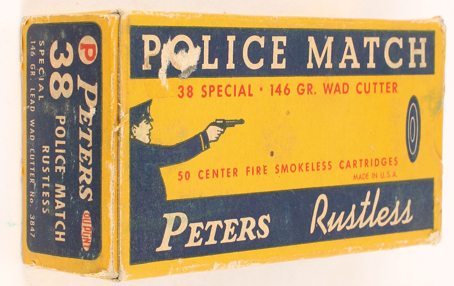 Peters, Police Match, .38 Special, 146 Grain Lead Wad Cutter, Full, 1pc. Yellow blue & white box, box is solid with very good color, some age soiling & shelf wear, some corner wear, minor edge wear, end flaps are solid, ammo is excellent. Grade: Very Good ++ - Value: 40 to 60