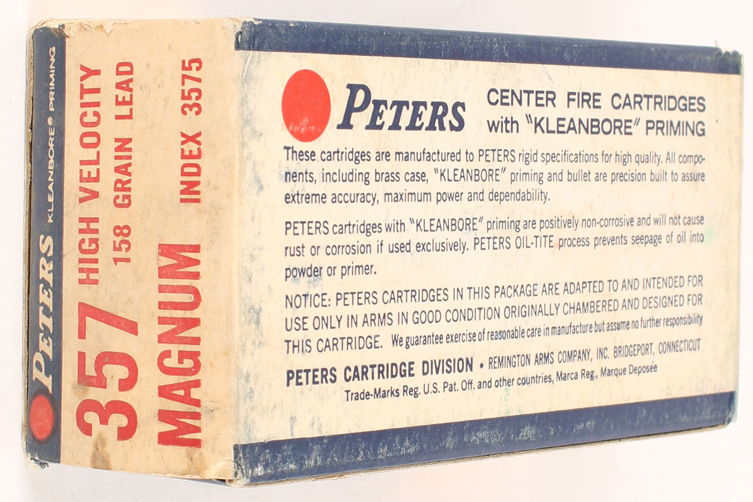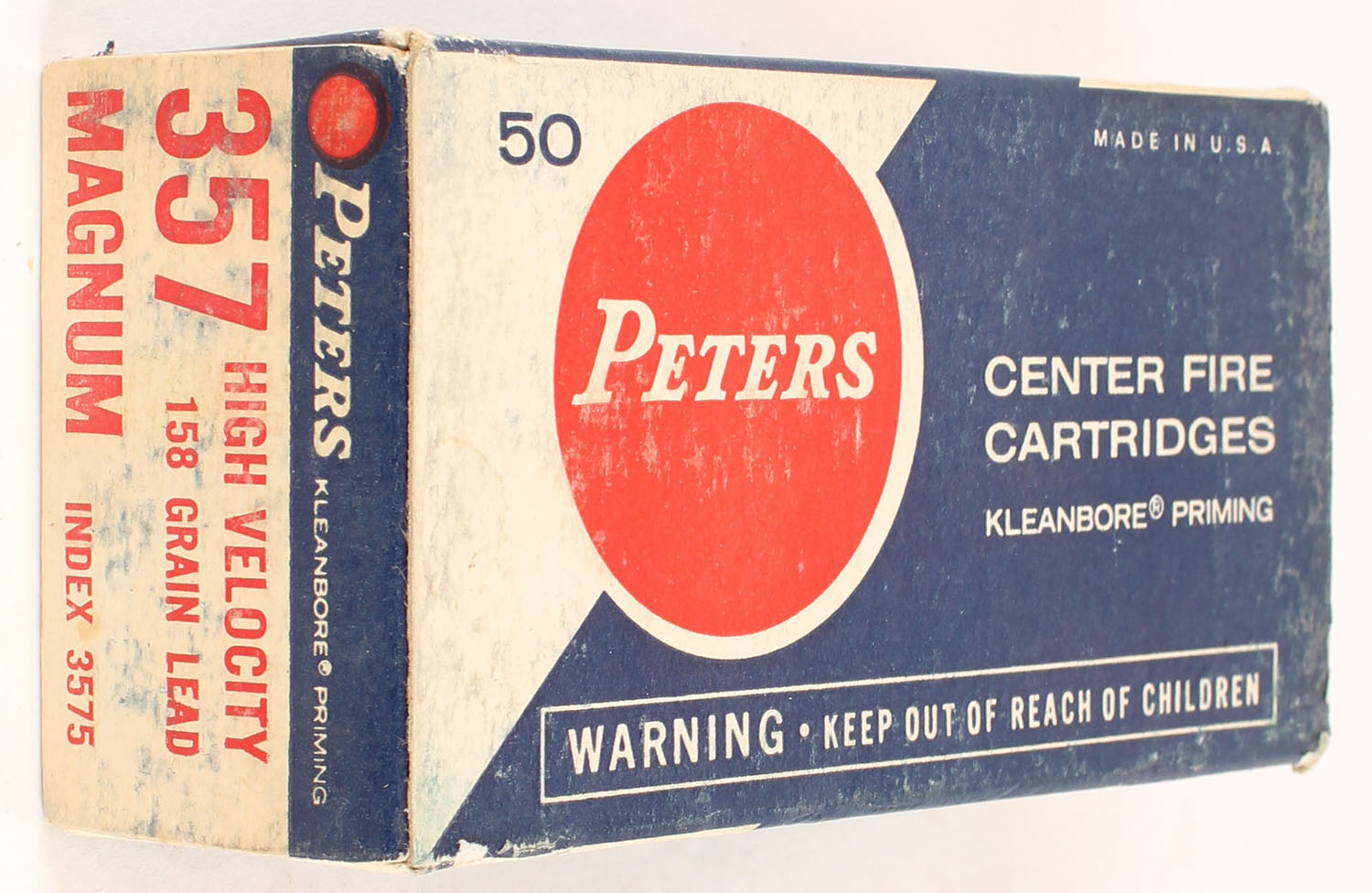 Peters, Center Fire Cartridges, .357 Magnum, 158 Grain Lead, High Velocity, Full, 1pc. Blue white & red box, box is solid with very good to excellent color, some shelf & corner wear, edges are mostly crisp, end flaps are solid, ammo is excellent. Grade: Excellent - Value: 40 to 60