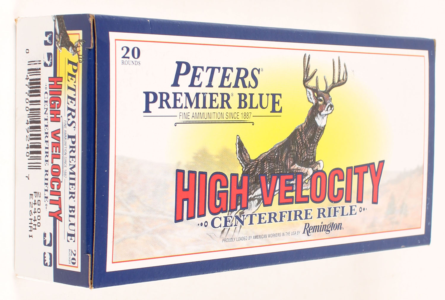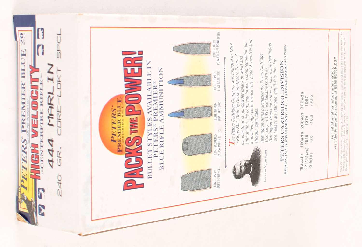 Peters, Premier Blue High Velocity, .444 Marlin, 240 Gr. Core-Lokt Special, Full, 1pc. White & blue box, box is near mint with minty color, only has a crease on bottom, corners are sharp, edges are crisp, end flaps are solid, ammo is excellent. Grade: Excellent ++ - Value: 120 to 160