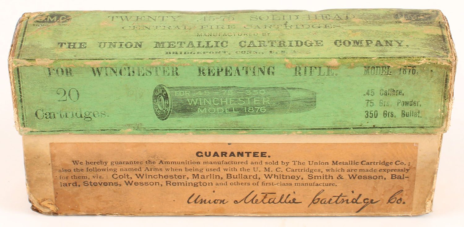 UMC, Central Fire Cartridges, .45-75 Winchester, 350 Grs. Bullet, Full, 2pc. Buff box with green label, box is solid with good to very good color, age soiling, some color fading & shelf wear, some edge & corner wear, label is intact, ammo is very good to excellent. Grade: Very Good ++ - Value: 160 to 240