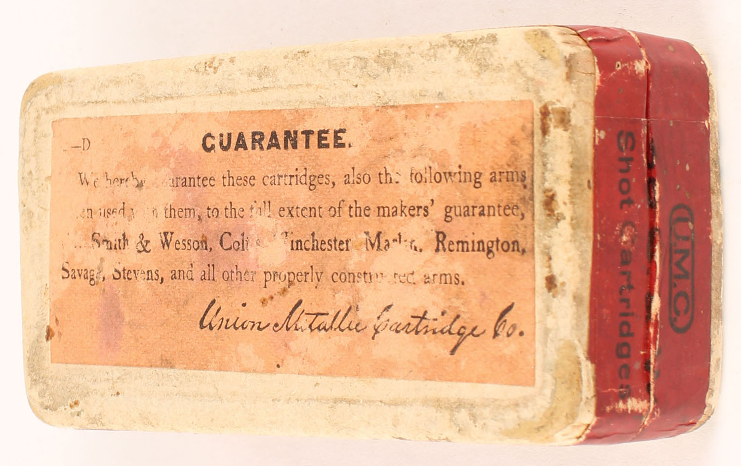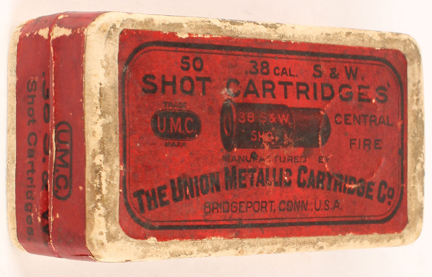 UMC, Shot Cartridges, .38 Smith & Wesson Shot, FULL & SEALED, 2pc. Buff box with red top & side sealing labels, box is solid with very good color, some age soiling & shelf wear, some edge & corner wear, labels are intact. Grade: Very Good + - Value: 50 to 75