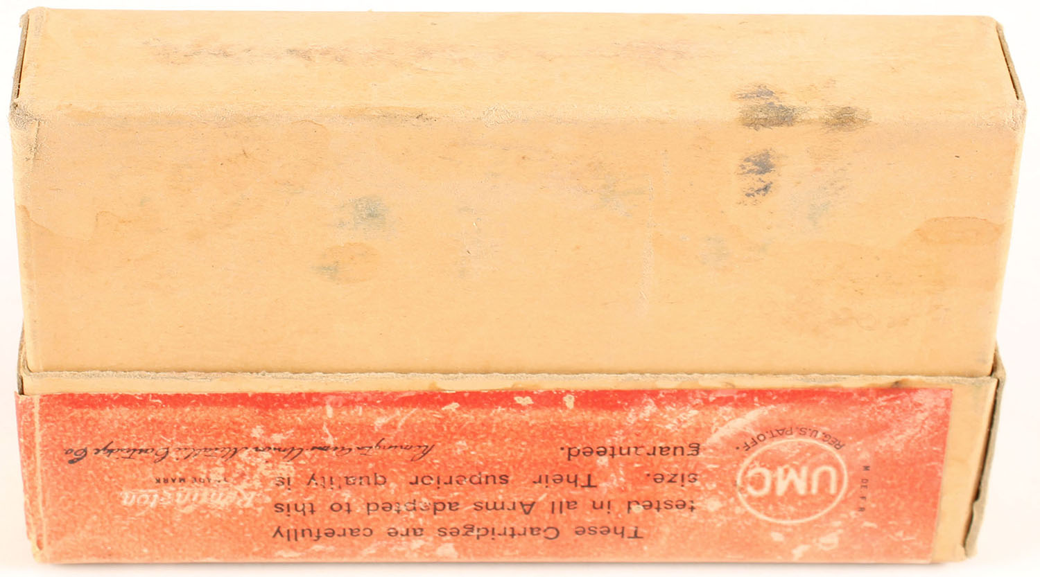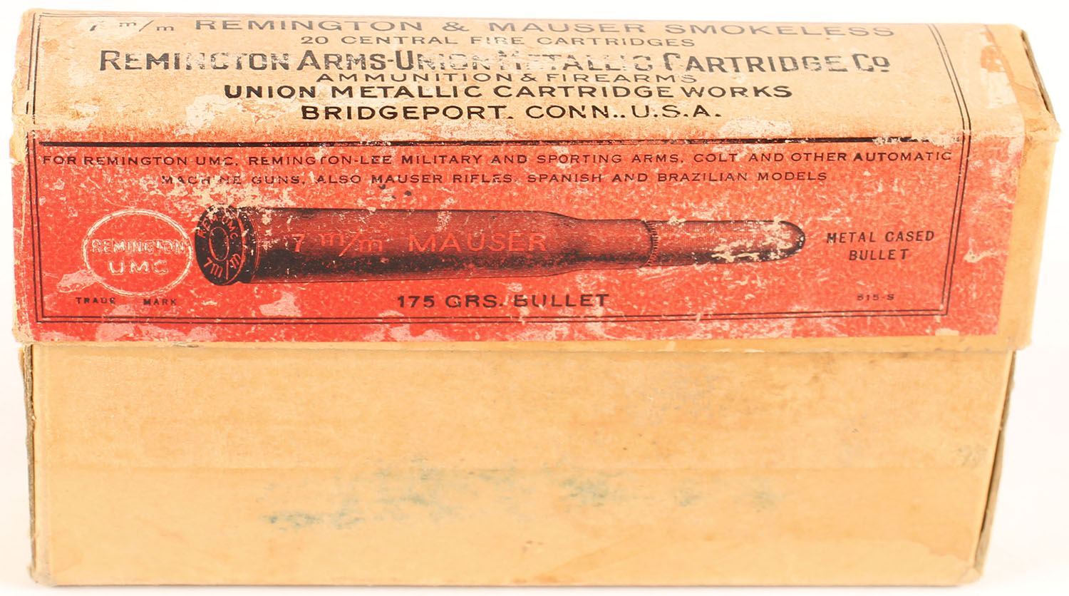 REM-UMC, Central Fire Cartridges, 7mm Mauser, 175 Grs. Metal Cased Bullet, Partial 19rds. 2pc. Buff box with red label, box is solid with good color, color fading on top, shelf wear, minor edge & corner wear, label is intact, ammo is very good, some rounds have cracked necks. Grade: Very Good + - Value: 20 to 30