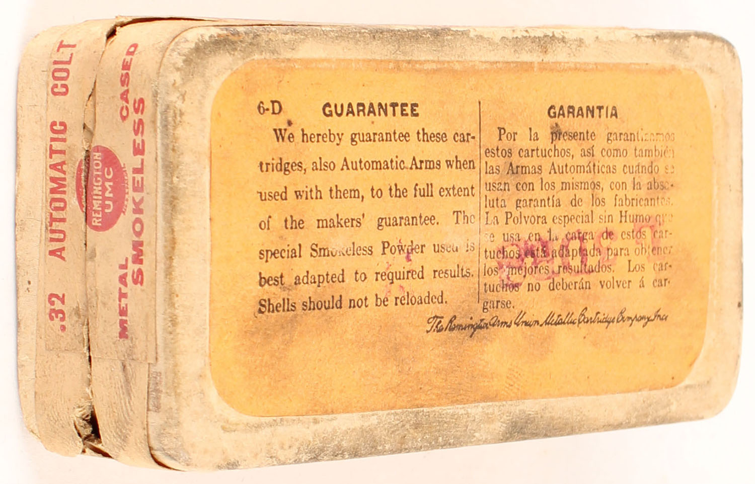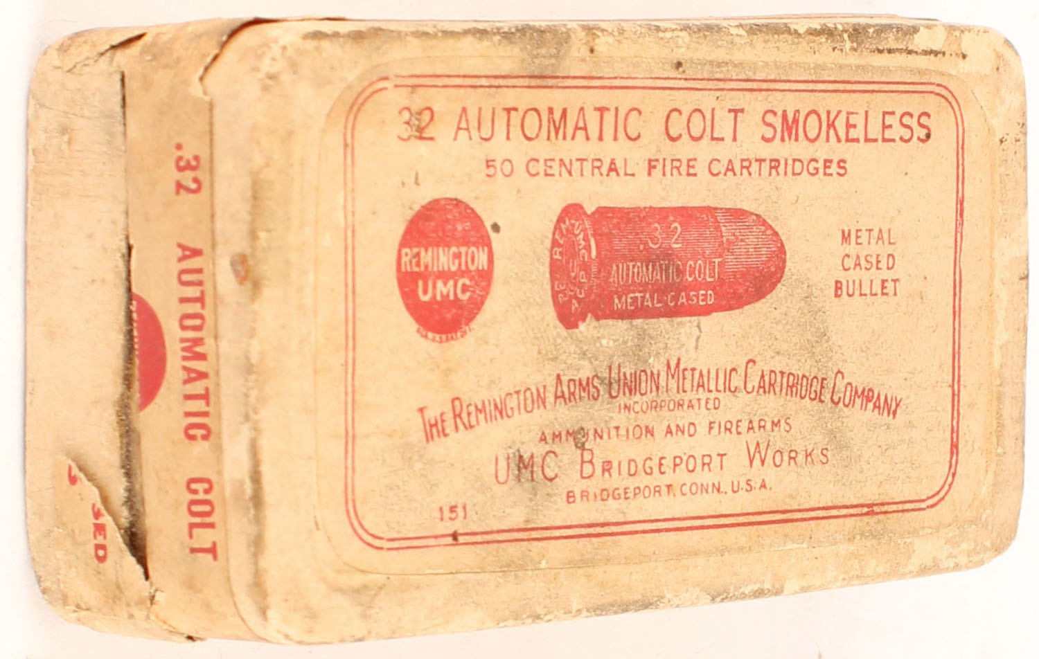REM-UMC, Central Fire Cartridges, .32 Automatic Colt, Metal Cased Bullet, Smokeless, Full, 2pc. Buff box with buff top & side sealing labels, box is solid with very good color, some age soiling, minor edge & corner wear, labels are intact, ammo is very good. Grade: Very Good ++ - Value: 30 to 45
