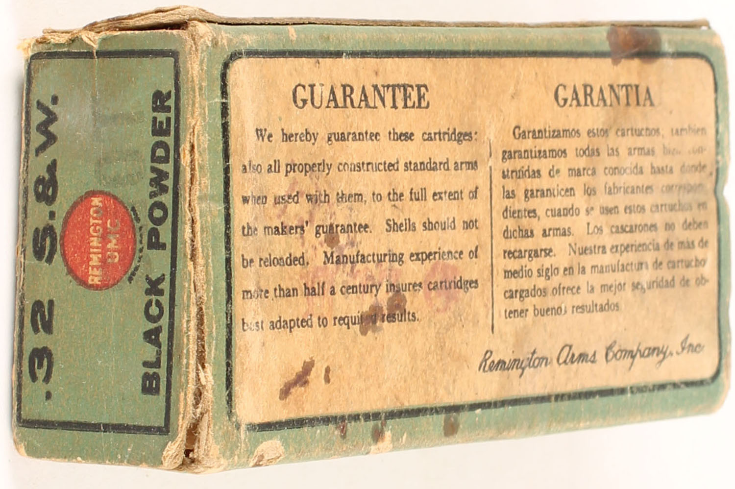 REM-UMC, Central Fire Cartridges, .32 Smith & Wesson Shot, Full, 1pc. Blue box with ''SHOT'' over-stamp, missing left end flap, good color, age soiling, some color fading, some edge & corner wear, right end flap is solid, ammo is good to very good. Grade: Good + - Value: 16 to 24