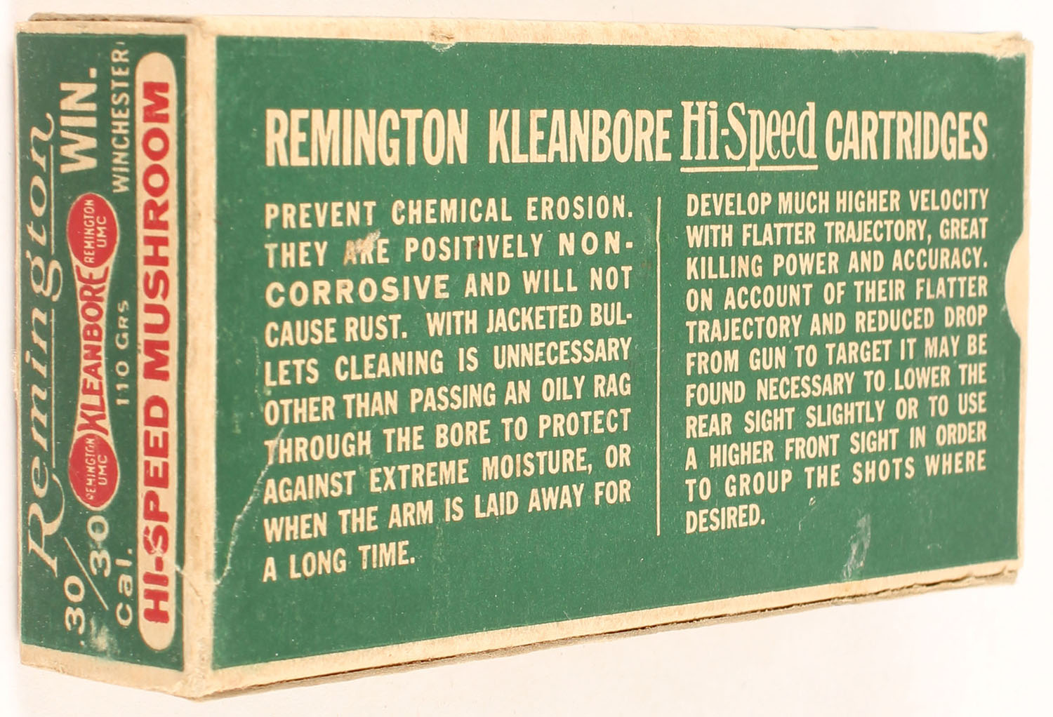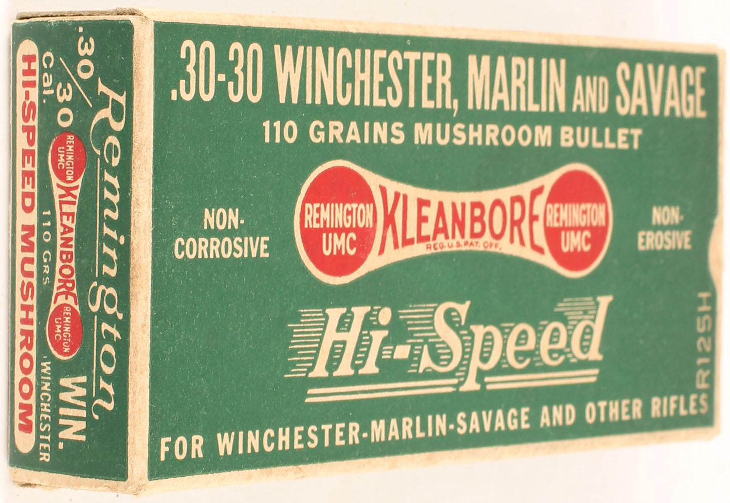 Remington, Kleanbore Hi-Speed, .30-30 Winchester, 110 Grains Mushroom Bullet, Full, 1pc. Green buff & red dog bone box, box is solid with excellent color, very minor corner wear, edges are mostly crisp, end flaps are solid, ammo is excellent. Grade: Excellent + - Value: 40 to 60