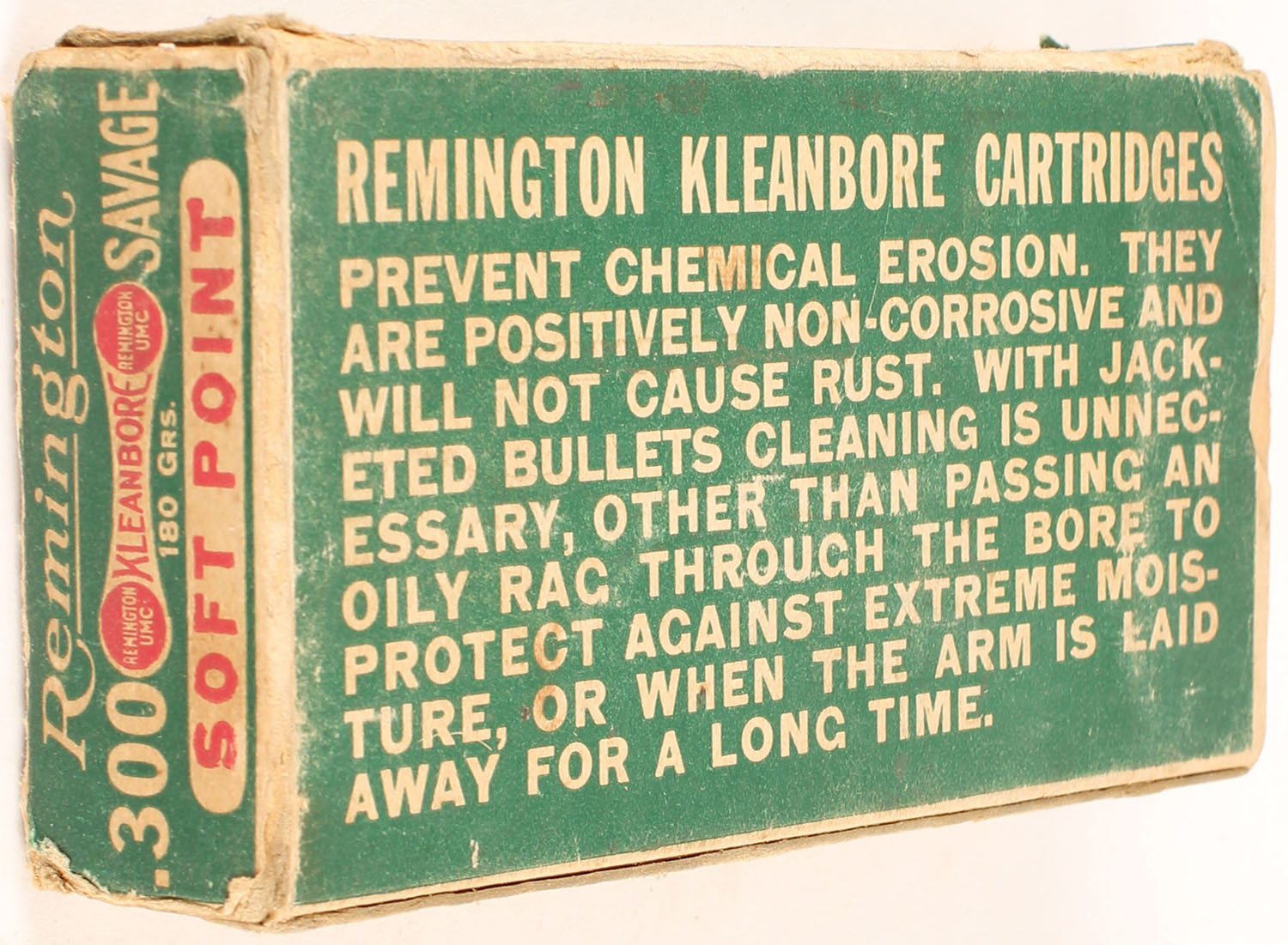 Remington, Kleanbore, .300 Savage, 180 Grains Soft Point Bullet, Full of mixed ammo, 1pc. Green buff & red dog bone box, box is solid with very good color, some age soiling, corner wear, very minor edge wear, end flaps are solid, ammo is very good. Grade: Very Good + - Value: 24 to 36
