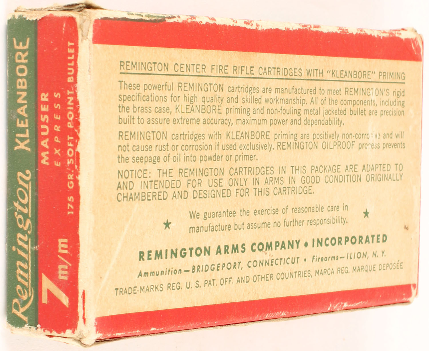Remington, Kleanbore Express, 7mm Mauser, 175 Grain Soft Point Bullet, Full (10rds. Correct, 10rds. Incorrect), 1pc. Green buff & red box, box is solid with very good color, some age soiling, some edge & corner wear, end flaps are solid, ammo is very good. Grade: Very Good + - Value: 16 to 24