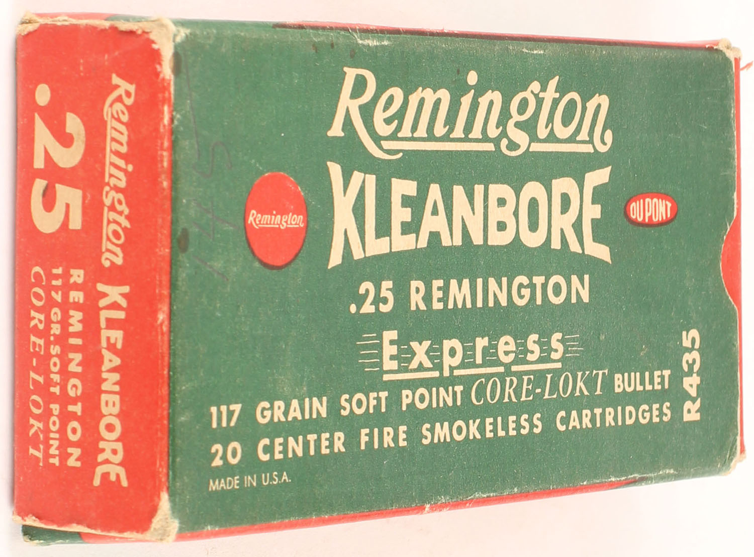 Remington, Kleanbore Express, .25 Remington, 117 Grain Soft Point Core-Lokt Bullet, Full, 1pc. Green buff & red box, box is solid with excellent color, some corner wear, very minor edge wear, end flaps are solid, factory seam has unadhered, end flaps are solid, ammo is excellent. Grade: Excellent - Value: 60 to 90