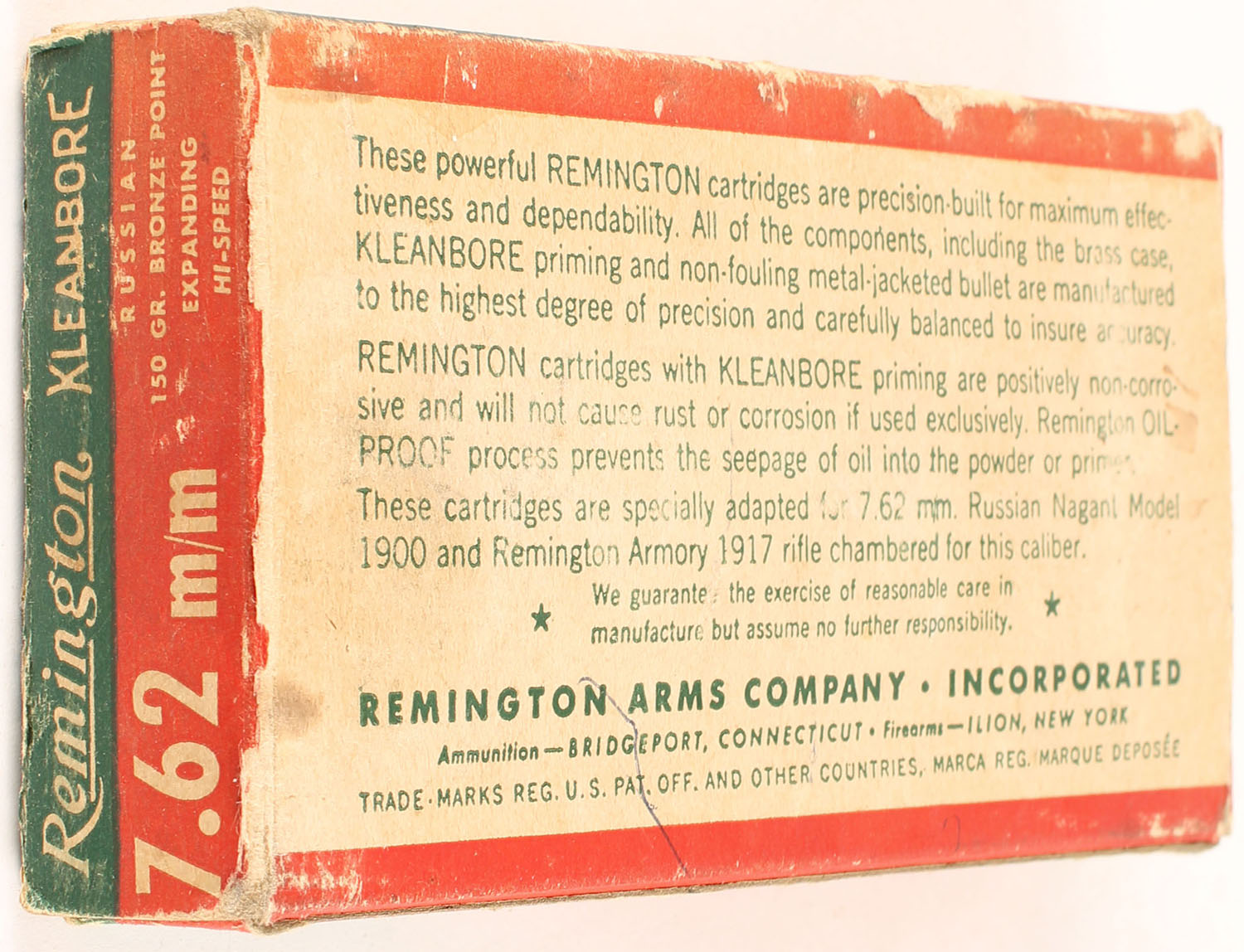 Remington, Kleanbore Hi-Speed, 7.62mm Russian, 150 Grain Bronze Point Bullet, Full (18rds. Correct, 2rds. Incorrect), 1pc. Green buff & red box, box is solid with very good color, minor shelf wear, some edge & corner wear, end flaps are solid, ammo is excellent. Grade: Very Good + - Value: 20 to 30