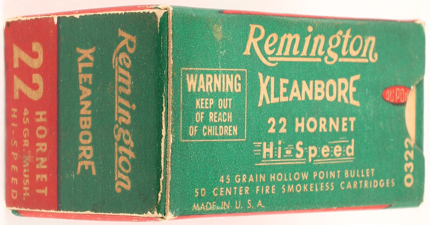 Remington, Kleanbore Hi-Speed, .22 Hornet, 45 Grain Hollow Point Bullet, Full, 1pc. Green red & buff box, box is solid with excellent color, very minor age soiling & corner wear, edges are crisp, end flaps are solid, ammo is excellent. Grade: Excellent + - Value: 70 to 100