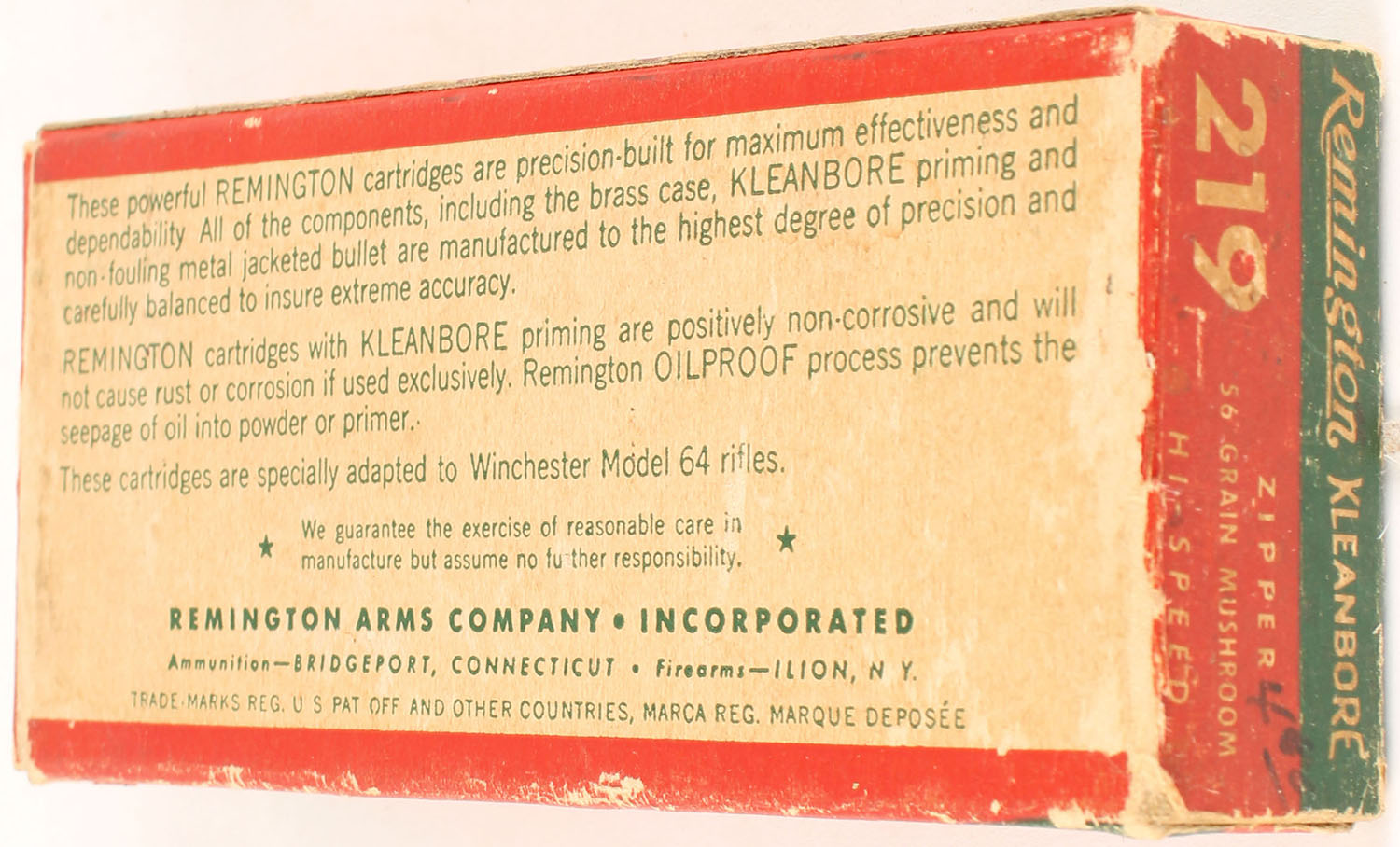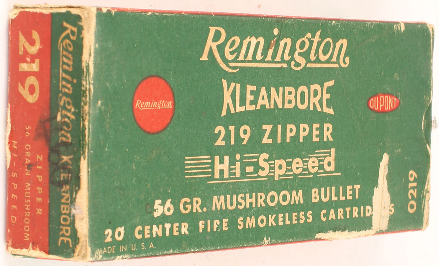 Remington, Kleanbore Hi-Speed, .219 Zipper, 56 Grain Mushroom Bullet, Full, 1pc. Green buff & red box, box is solid with very good color, minor age soiling & shelf wear, scuff on top, some edge & corner wear, end flaps are solid, ammo is excellent. Grade: Very Good ++ - Value: 120 to 160