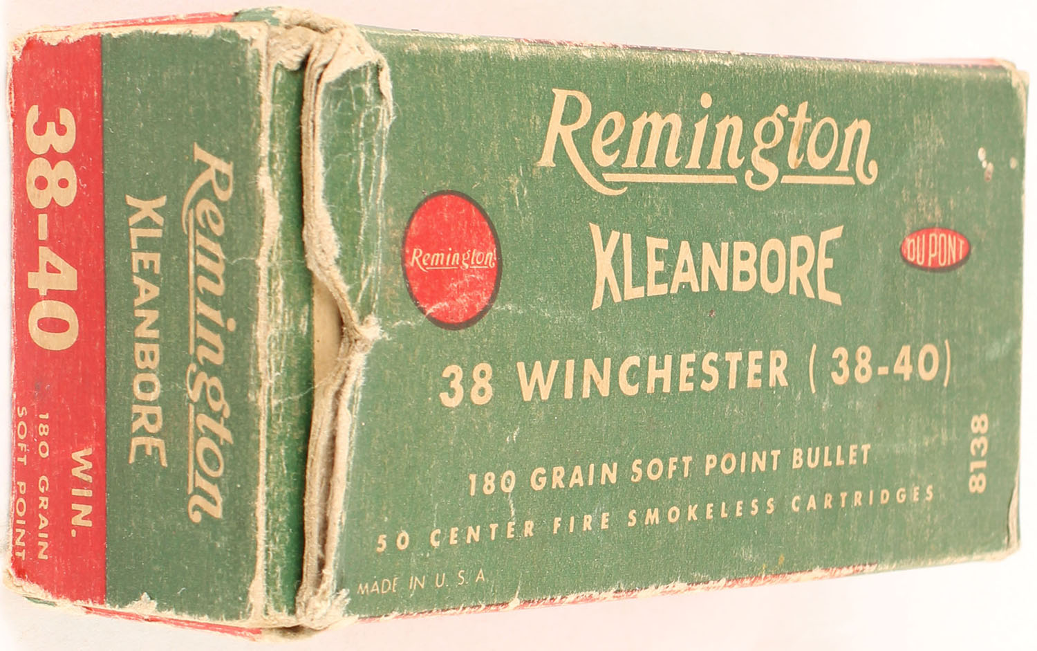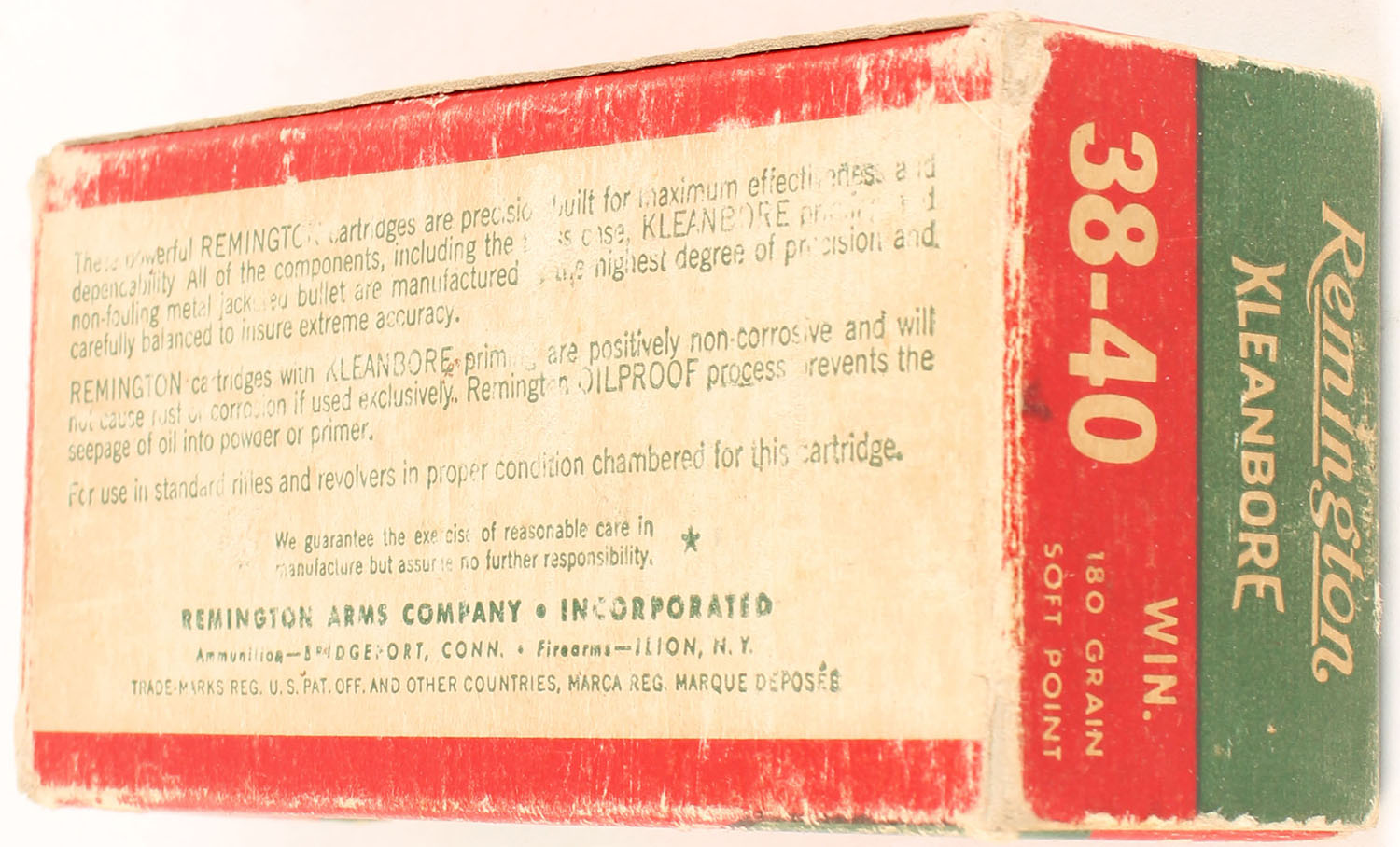 Remington, Kleanbore, .38 Winchester, (.38-40), 180 Grain Soft Point Bullet, Full of mixed ammo (mostly correct), 1pc. Green buff & red box, box is solid with very good color, some color fading, corner wear, some edge wear, end flaps are solid, ammo is very good. Grade: Very Good - Value: 100 to 150