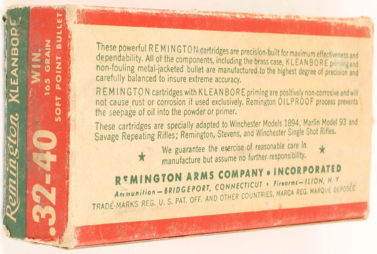 Remington, Kleanbore, .32-40 Winchester, 165 Grain Soft Point Bullet, Full, 1pc. Green buff & red box, box is solid with very good color, some color fading & shelf wear, some edge & corner wear, end flaps are solid, ammo is excellent. Grade: Very Good ++ - Value: 70 to 100